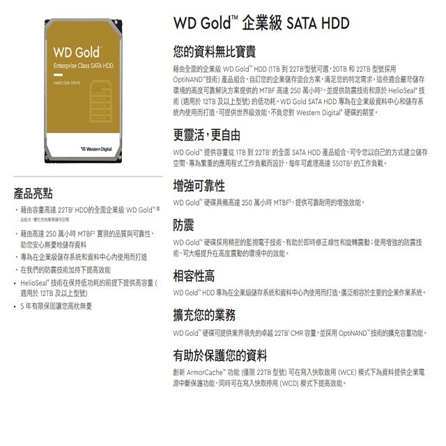 WD Gold™ 硬碟具備高達 250 萬小時 MTBF3,提供可靠耐用的增強效能。