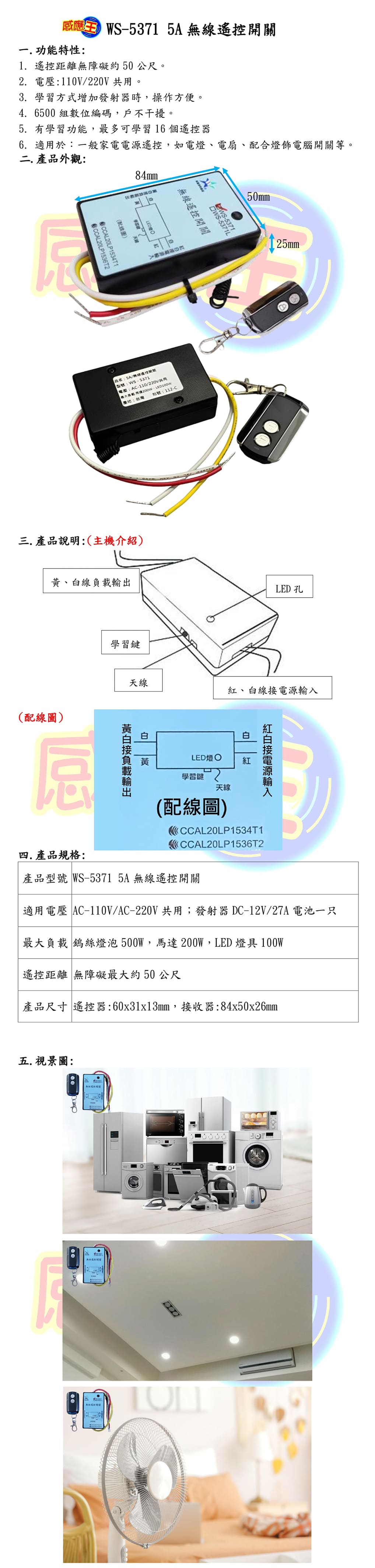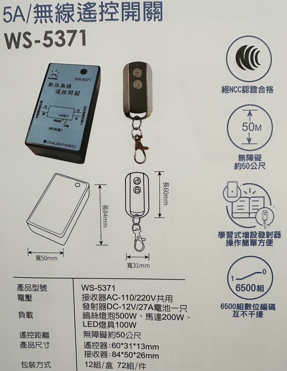 【WUSHING伍星】WS-5371 5A Wireless Remote Control Switch