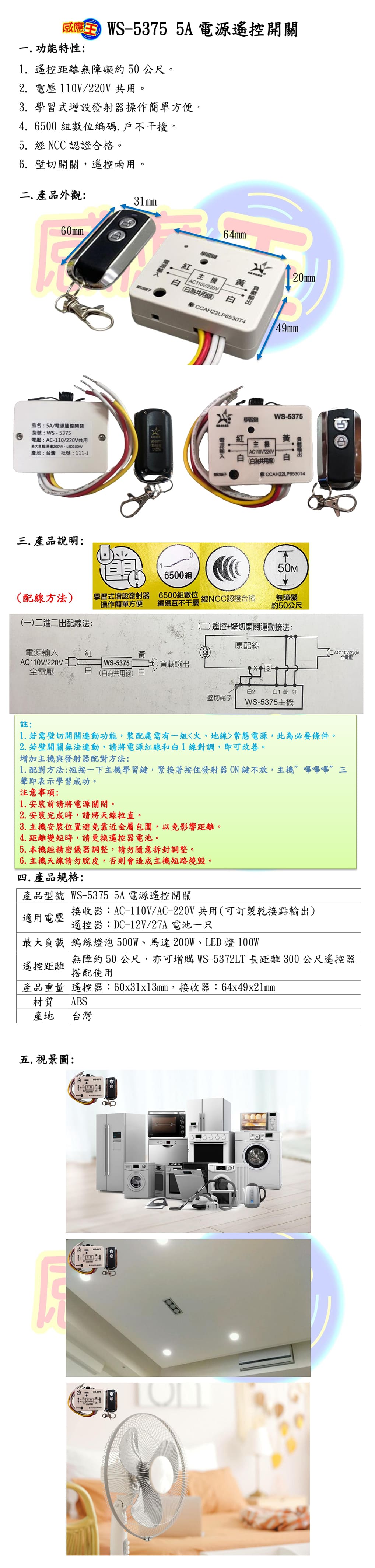 【WUSHING伍星】WS-5375 5A Power Remote Control Switch