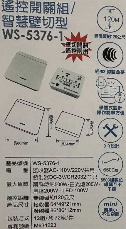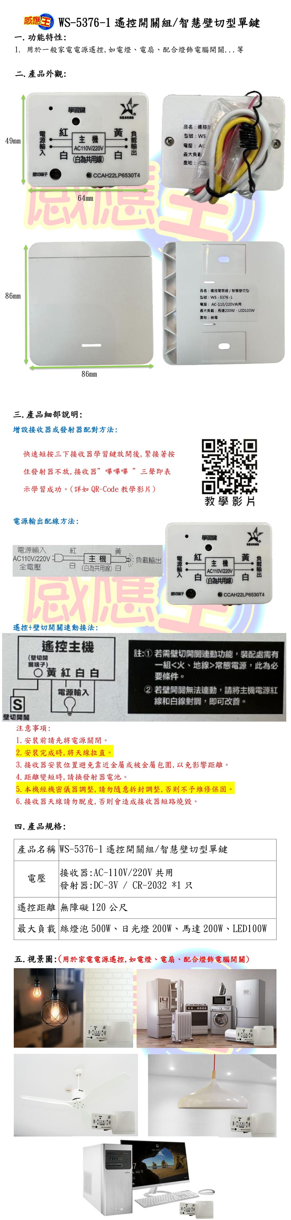 【WUSHING伍星】WS-5376-1 Remote Control Switch Set / Smart Wall-Mounted Single Button