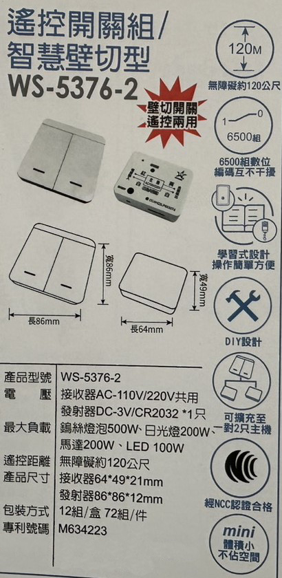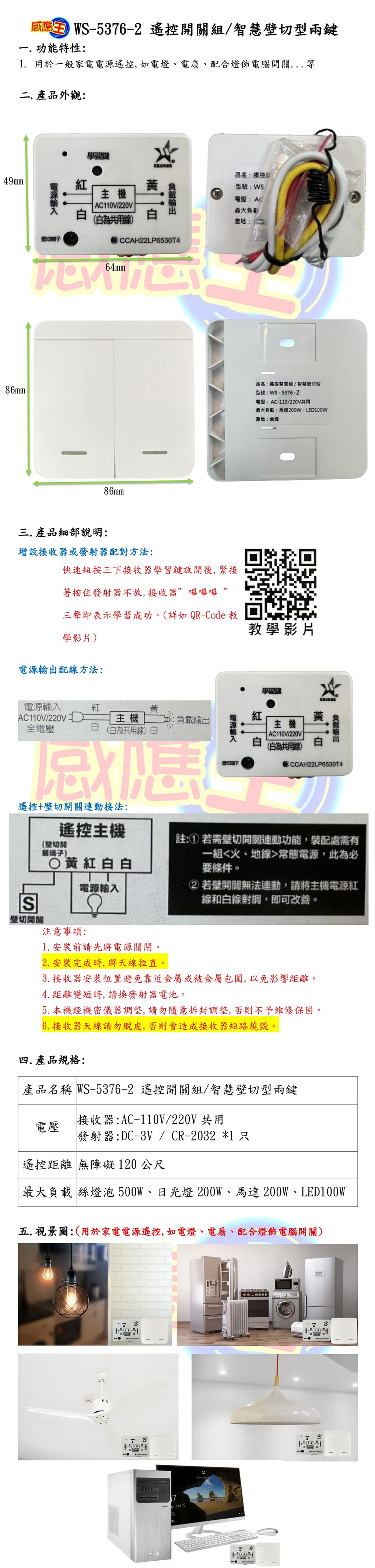 【WUSHING伍星】WS-5376-2 Remote Control Switch Set / Smart Wall-Mounted Two-Button
