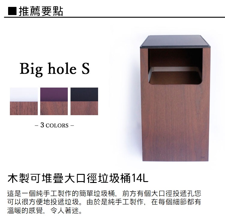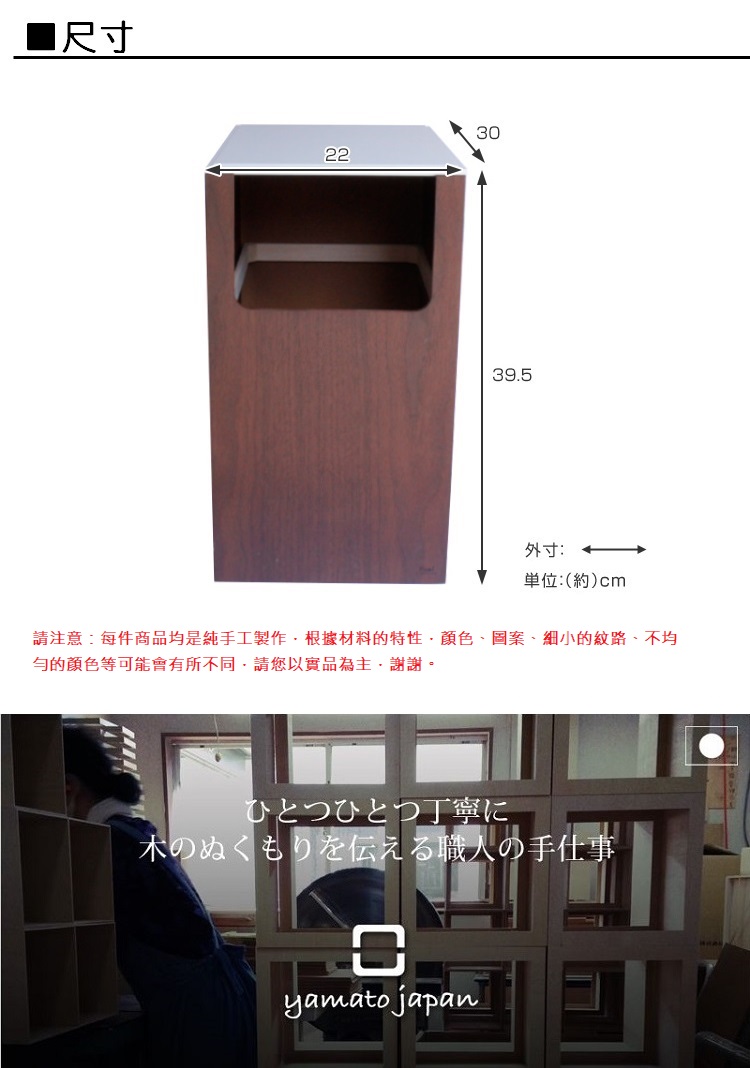 使用生長在潔淨的水和大自然中的木材每個木材都是精心挑選而出,木匠們用著傳統與現代的技術及純手工製作成許多與我們日常生活息息相關的周邊用品。每件商品都是獨一無二的。yamotojapan希望透過木製商品的柔和感與溫暖為顧客帶來更舒適的生活品質尺寸:大約寬度22 x深度30 x高度39.5(cm)內部容量:14公升材質:木材顏色:白色,黑色,紫色原產國:日本請注意:每件商品均是純手工製作,根據材料的特性,顏色、圖案、細小的紋路、不均勻的顏色等可能會有所不同,但是所有產品均由製造商檢查後發貨,請您以實品為主,謝謝。