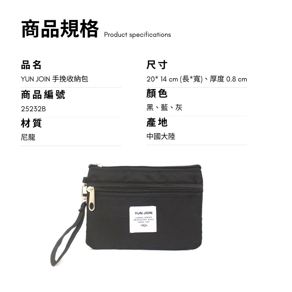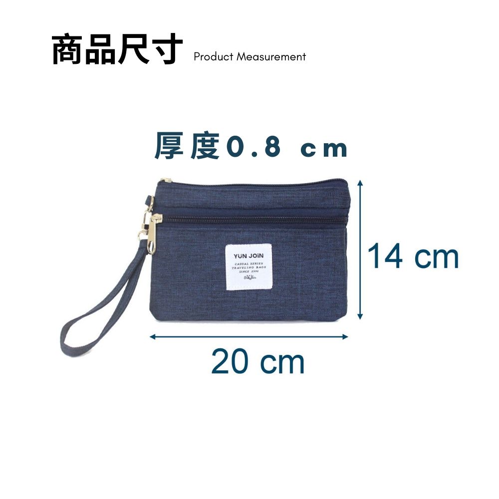 感謝各位蒞臨 YUN JOIN本商店 100% 公司現貨供應且商品一律附上發票合法登記營業之店家,安全品質有保障。【產品介紹】YUN JOIN 日系織面多功能手挽收納包適合旅行、外出隨身使用。可放零錢、手機、證件。也可當收納包使用,收納化妝品、隨身小物。材質:尼龍布結構:手拿包顏色:藍、灰、黑色#YUNJOIN #旅行 #休閒 #潮流 #手拿包 #萬用包 #化妝包 #收納 #方便 #輕巧────────────────────────────────────────────────────────【客服】線上快速諮詢有問題歡迎詢問,專人在線為您服務。若有任何問題或是收到商品時發現異常,可拍照片傳至聊聊客服人員上班時間會馬上為您處理。服務時間:週一至週五09:00~18:00