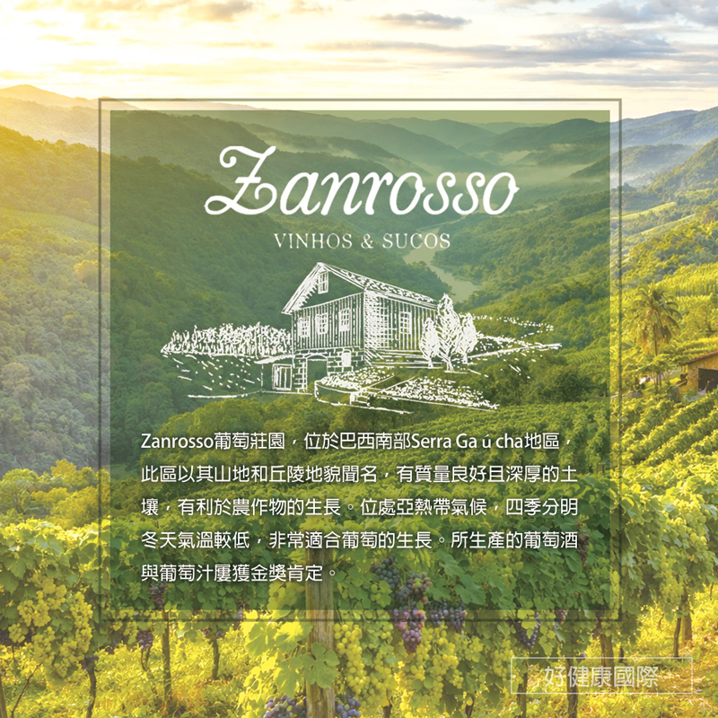 源自 1914 年,義大利贊羅索(Zanrosso)家族將義大利傳統的農耕與榨汁藝術帶到了巴西南部 Serra Gaúcha 地區。歷經百年的耕耘,贊羅索莊園結合了肥沃的壤土與最適宜葡萄生長的氣候條件,將對土地的熱愛凝聚成每一滴珍貴的葡萄原汁。