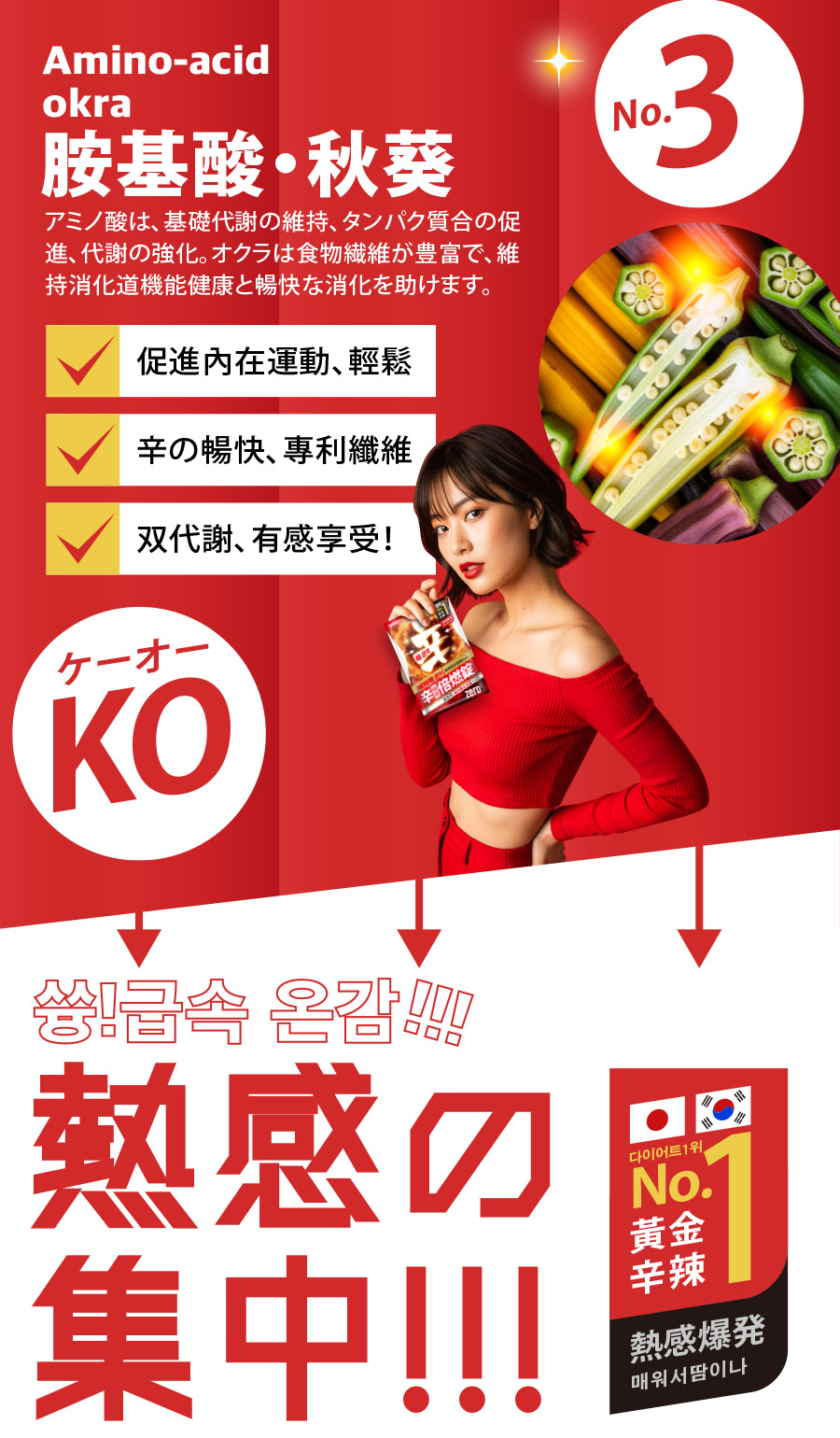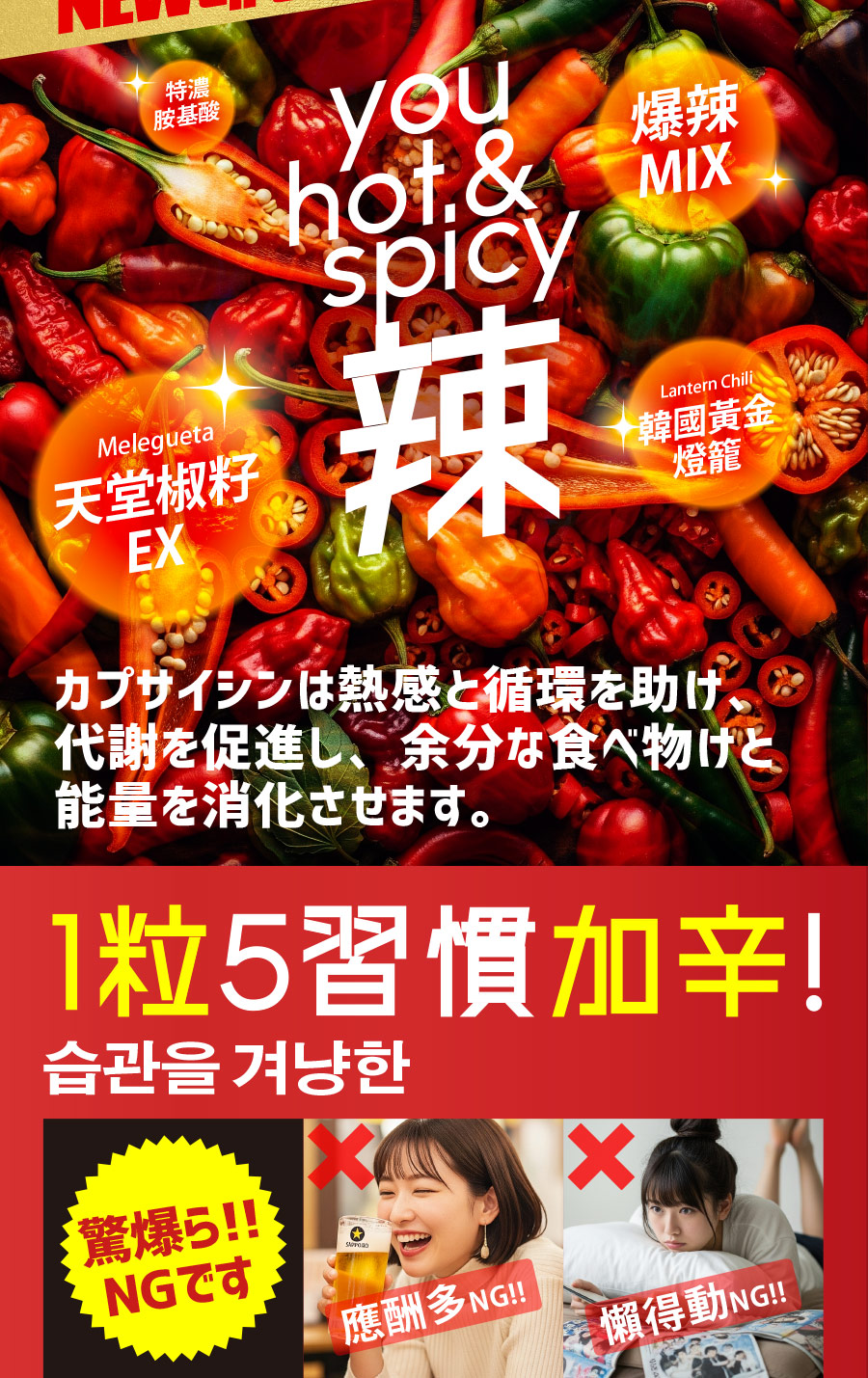 成分:韓國黃燈籠辣椒、天堂椒籽、辣椒萃取、綜合胺基酸、玉米來源可溶性纖維、燕麥纖維、薑黃