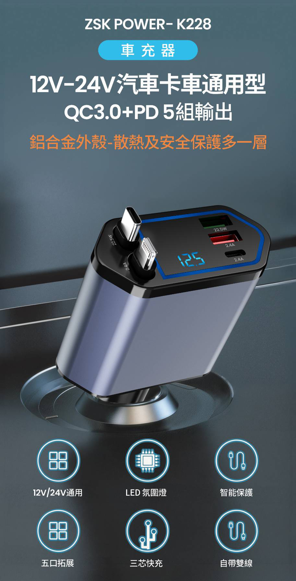 ZSK POWER K228 Fast Car Charger with Voltage Display