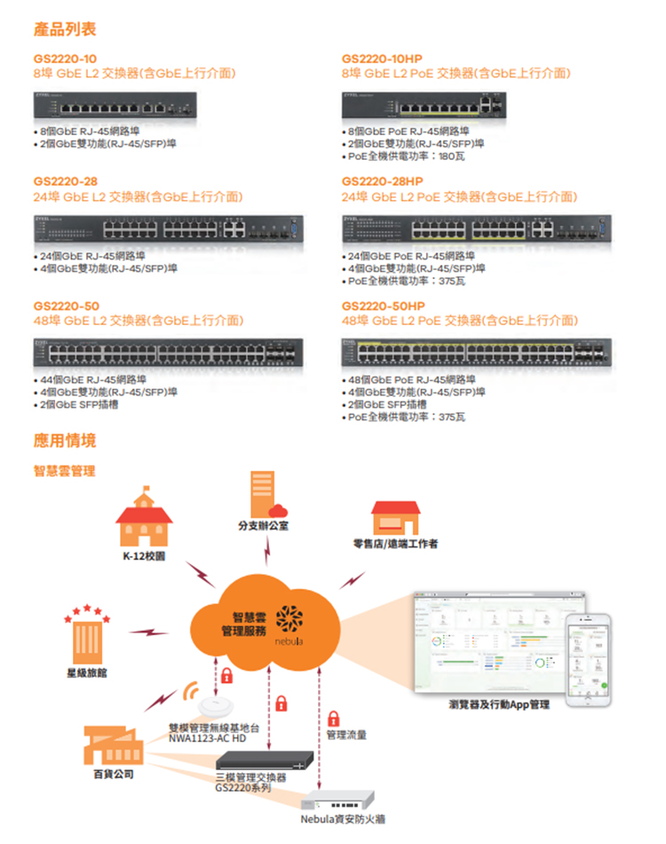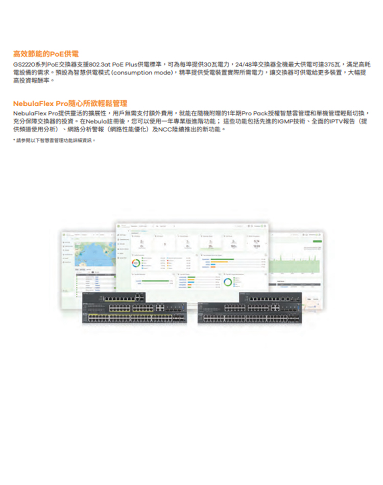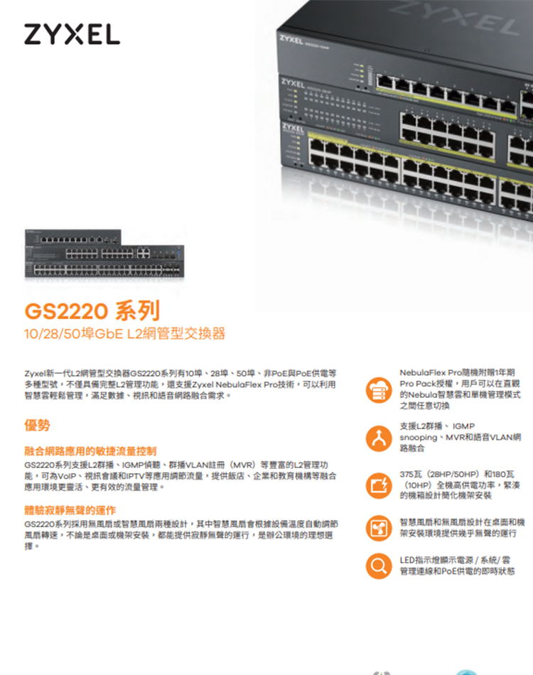含GbE上行介面 802.3at PoE埠 : 24 100/1000 Mbps : 24 Gigabit雙功能埠(RJ-45/SFP) : 4 -業界首創三模網管交換器- GS2220 系列是第一款具有Nebula智慧雲管理、單機管理和SNMP管理的三模網管交換器。 -強大的 L2 功能- GS2220系列具有豐富的L2交換器功能,可以為各種VoIP、視訊會議和IPTV調整流量,GS2220系列具備L2群播、IGMP偵聽、群播VLAN註冊(MVR)等進階流量控制功能,為酒店、企業和教育機構等融合應用提供更大的敏捷性和更有效的流量管理。 -為網路影音提供量身打造的體驗- -靜音運轉- 本系列包括無風扇和智慧型風扇型號,智慧型風扇會根據設備溫度自動調整轉速,交換器運作時,幾乎聽不到聲音。 -高效節能地供電給所有設備-