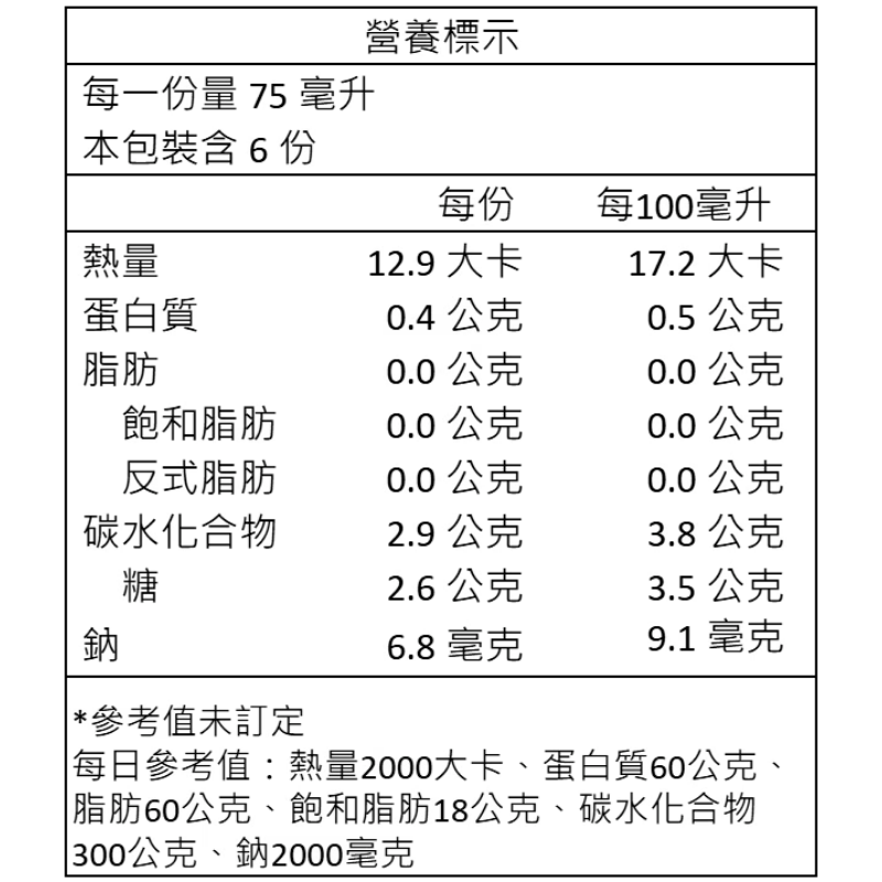 營養標示 每一份量 75毫升 本包裝含 6份 每份 每100毫升 熱量 12.9大卡 17.2大卡 蛋白質 0.4公克 0.5公克 脂肪 0.0公克 0.0公克 飽和脂肪 0.0公克 0.0公克 反式脂肪 0.0公克 0.0公克 碳水化合物 2.9公克 3.8公克 糖 2.6公克 3.5公克 鈉 6.8毫克 9.1毫克 *參考值未訂定 每日參考值:熱量2000大卡、蛋白質60公克、脂肪60公克、飽和脂肪18公克、碳水化合物300公克、鈉2000毫克