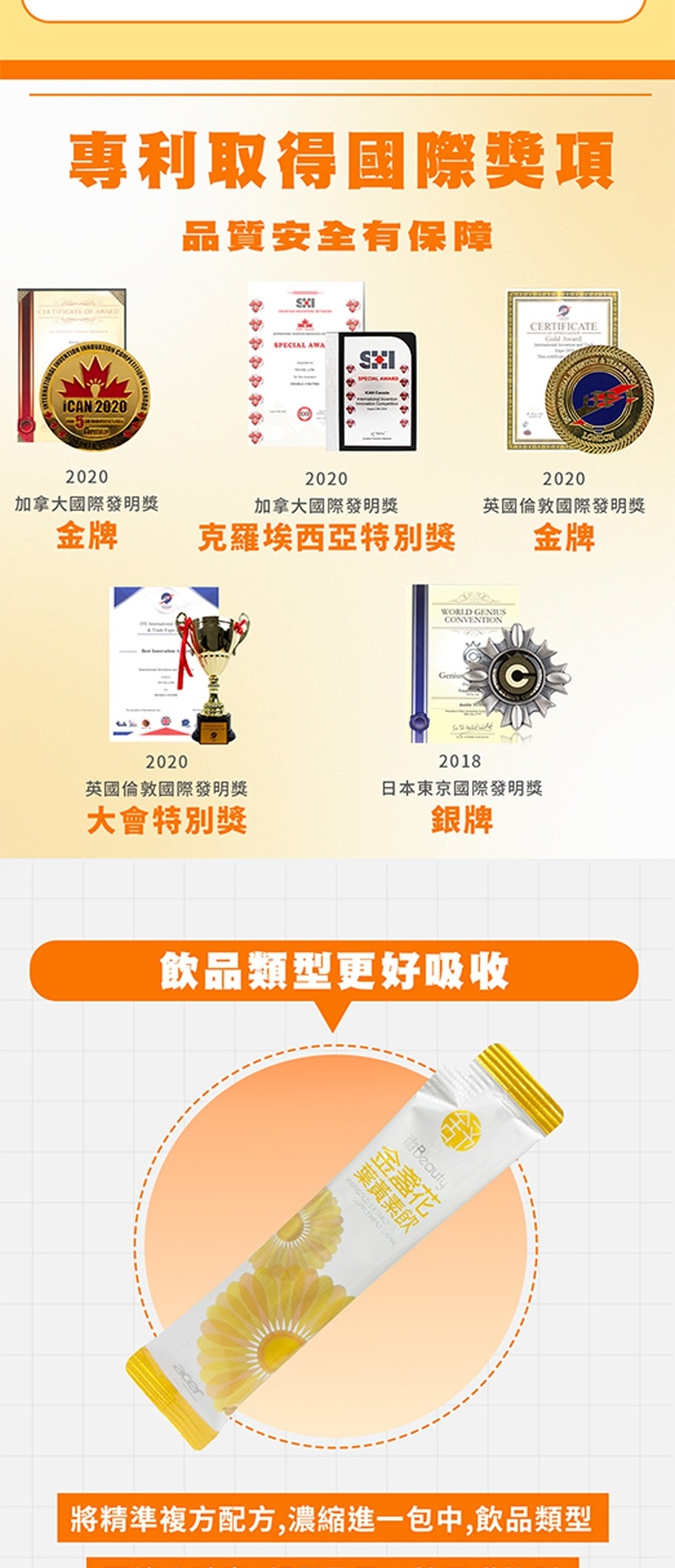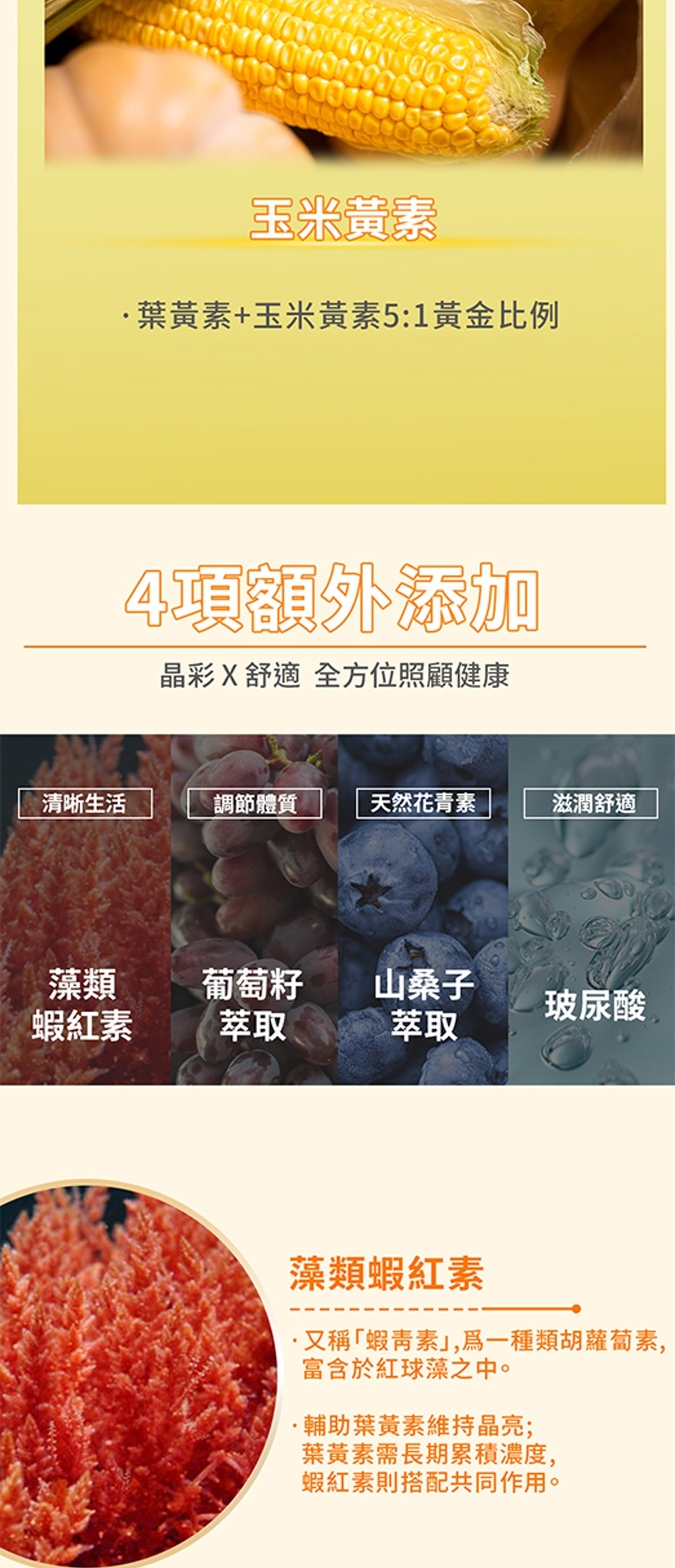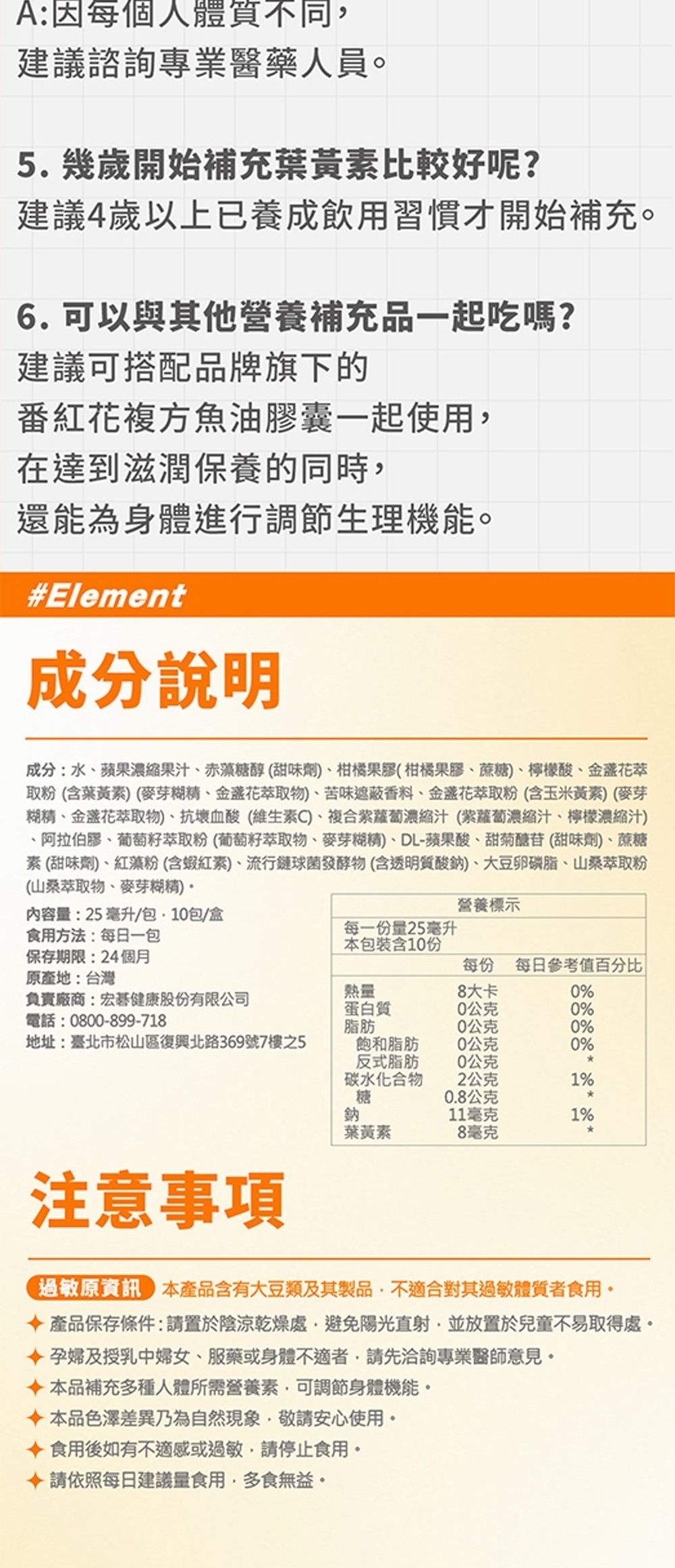 內容物成分(如含有豬、牛成分請加註國別):水、蘋果濃縮果汁、斥澡糖醇(甜味劑)、柑橘果膠(柑橘果膠、蔗糖)、檸檬酸、 金盞花萃取粉(含葉黃素)(麥芽糊精、金盞花萃取物)、苦味遮蔽香料、金盞花萃取粉(含玉米黃素) (麥芽糊精、金盞花萃取物)、抗壞血酸(維生素C)、複合紫蘿蔔濃縮汁(紫蘿蔔濃縮汁、檸檬濃縮汁) 、阿拉伯膠、葡萄籽萃取粉(葡萄籽萃取物、麥芽糊精)、DL-蘋果酸、甜菊醣苷(甜味劑)、蔗糖素(甜味劑)、 紅藻粉(含蝦紅素)、流行鏈球菌發酵物(含透明質酸鈉)、大豆卵磷脂、山桑萃取粉(山桑萃取物、麥芽糊精)。