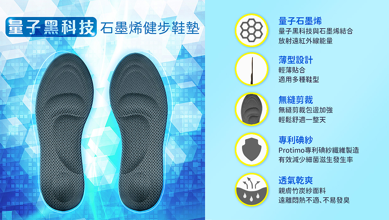 ♕量子石墨烯能量鞋墊可以幫助提升腿部耐力並維持良好平衡,登山、運動、健走、逛街… 任何時候都可以行動自如。