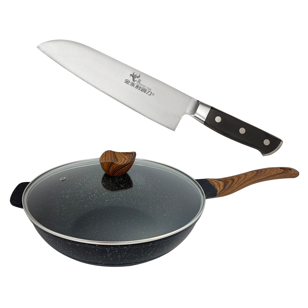 【金永利鋼刀】F8尖鋒三德刀|全能料理刀+lava cooking 台製32cm七層複合式合金不沾炒鍋