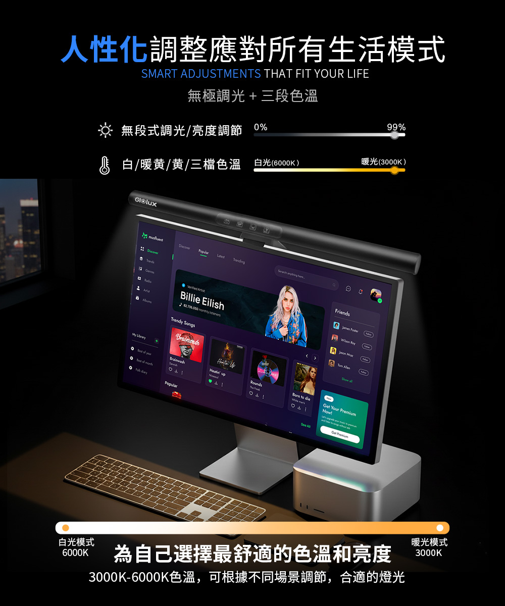 6000K 工作、4000K 閱讀、3000K 追劇。