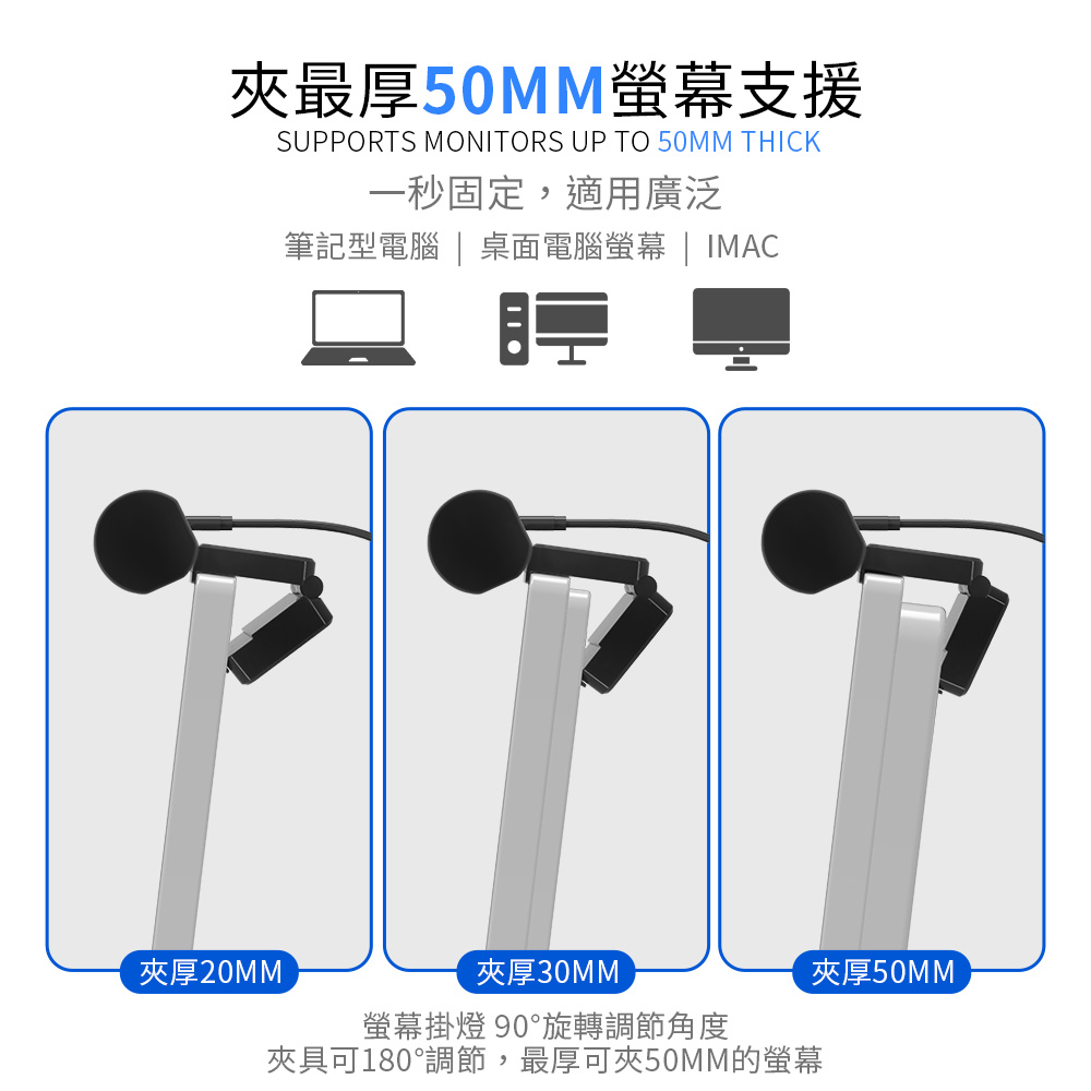 支援 20~50mm 螢幕厚度,連不規則螢幕也能穩穩夾上。
