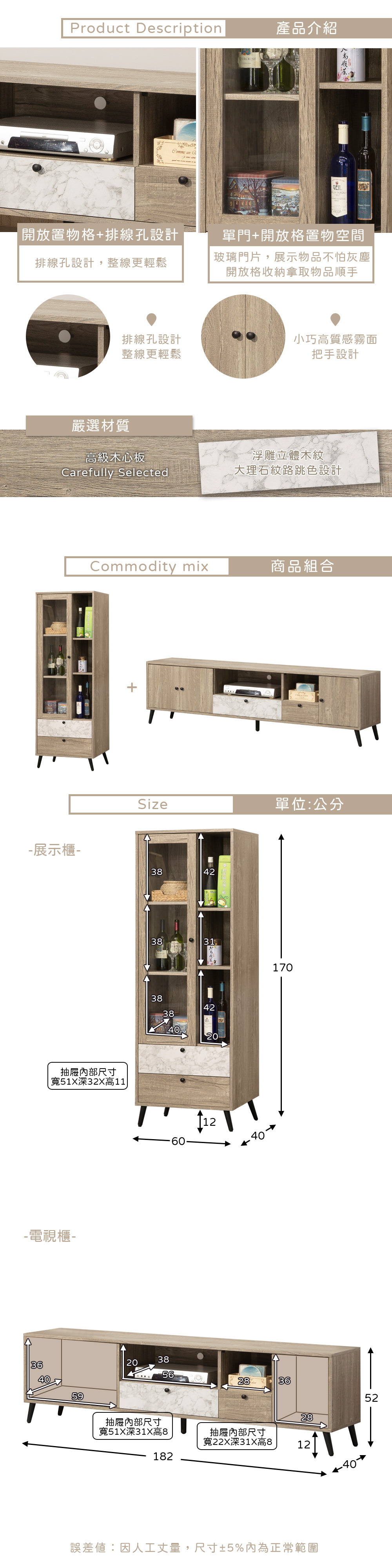 ◆油壓緩衝後鈕,不怕夾傷手◆木紋x大理石紋,蹦出新風格◆挑高腳座,掃地機器人好進◆免自行組裝,專人配送到府◆鄉村、田野梧桐原木風格◆四抽屜+開放格置物◆高櫃,單片玻璃門,三層置物空間整組配件:6尺電視櫃 + 2尺展示櫃電視櫃尺寸:寬 182 x 深 40 x 高 52 公分展示櫃尺寸:寬 60 x 深 40 x 高 170 公分材質:高級木心板顏色:灰橡木色產地:台灣誤差值:因人工丈量,尺寸±5%內為正常範圍