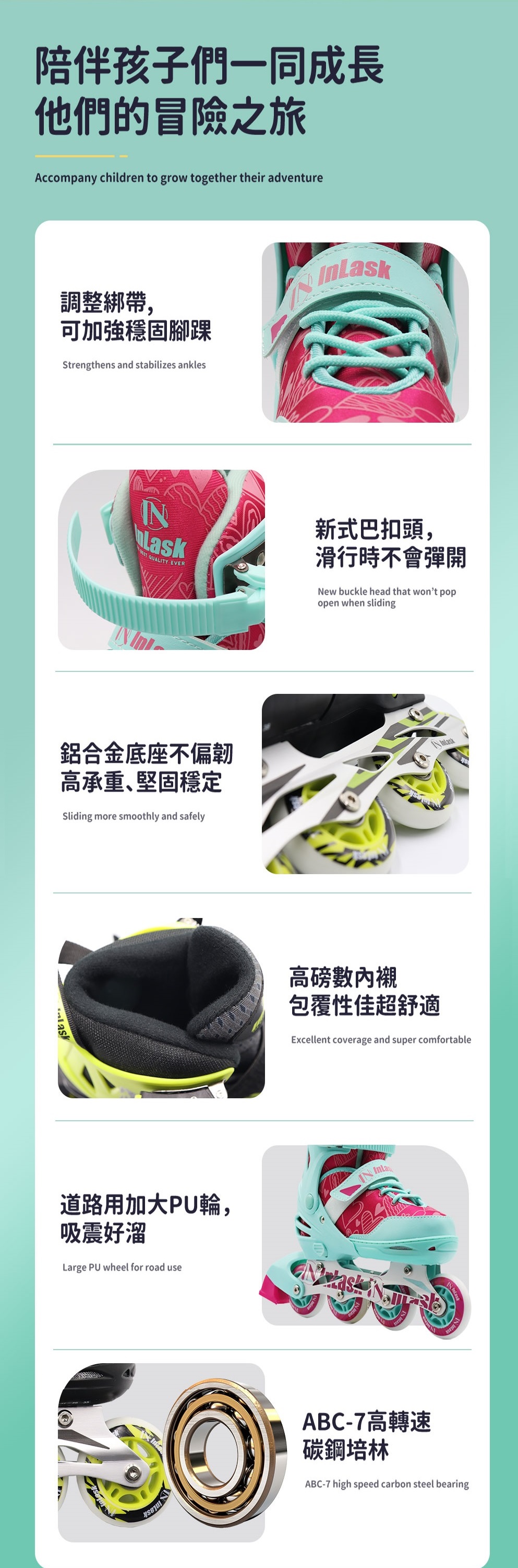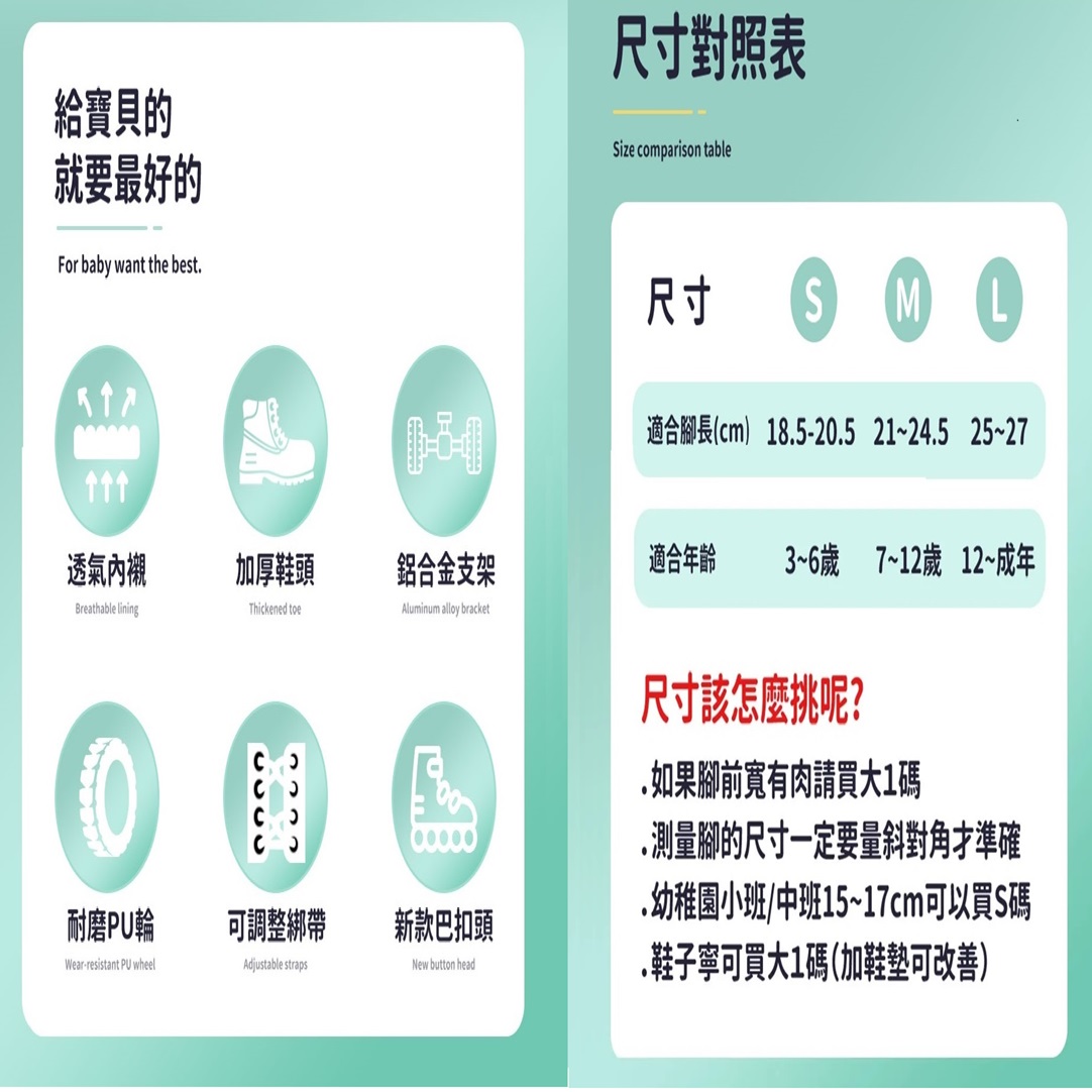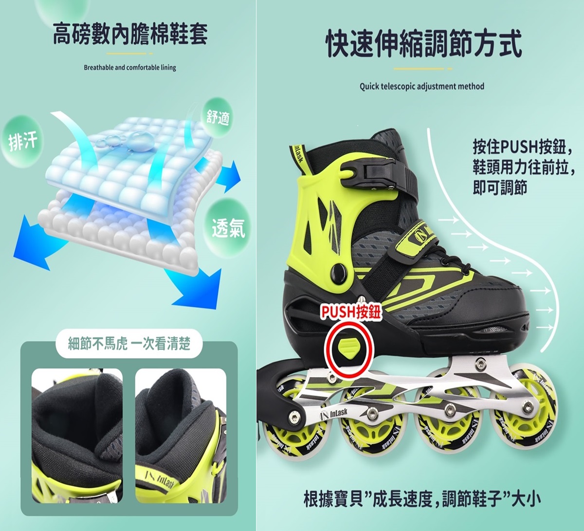 ◎警告使用者:不宜穿用不合尺碼之直排輪鞋,以防萬一之傷害。