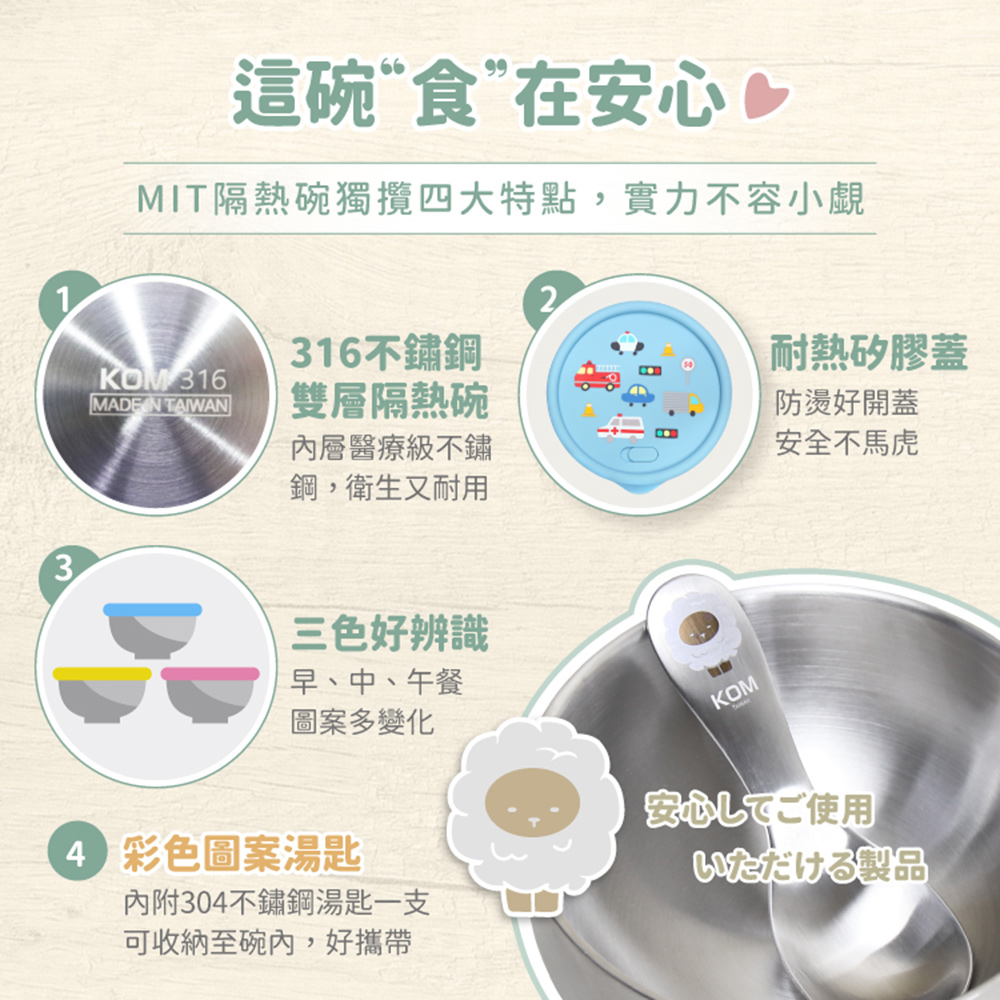 隔熱碗:獨角獸(粉)/汽車(藍)/恐龍(黃)材質:碗-(內)316不鏽鋼/(外)304不鏽鋼蓋-食品級矽膠上蓋(耐熱-30~210度C)尺寸:碗直徑約11.5cmm*高5.8cm重量:160g容量:約280ml產地:台灣製湯匙:可放入碗內材質:304不鏽鋼尺寸:約10cm重量:約34g*內附之304不鏽鋼湯匙款式隨機出貨兒童便當袋:款式:美人魚(藍)/機器人(綠)/太空人(黃)材質:帆布+珍珠棉尺寸:長22.5cmx寬12.5cmx高18.5cm容量:可裝三入KOM童碗產地:中國製注意事項:1. 不適用於各式爐具以及微波爐、電鍋進行加熱。2. 清洗請使用中性洗碗劑,並以軟布或海綿刷洗,勿用鋼刷或菜瓜布以免刮傷。3. 請避免重摔或敲擊本產品,以免產品變形。