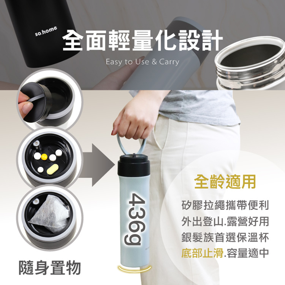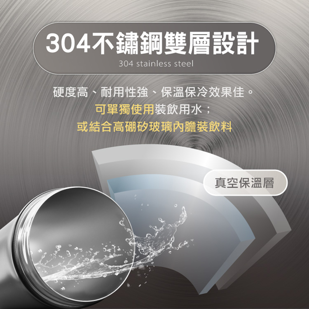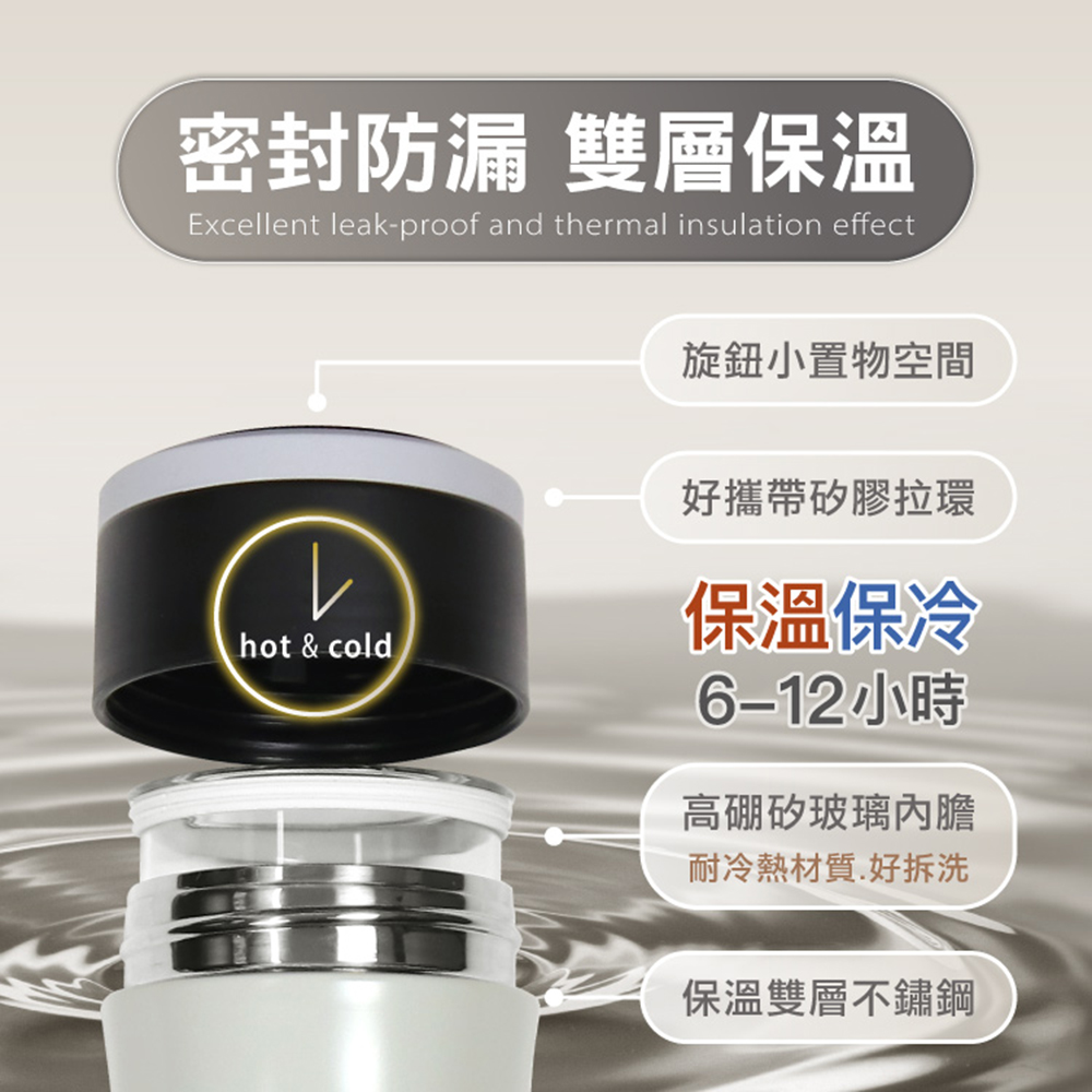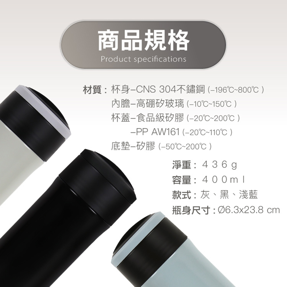 材質:•杯身-CNS304不鏽鋼(-196℃~800℃)•內膽-高硼矽玻璃(-10℃~150℃)•杯蓋-食品級矽膠(-20℃~200℃)+PP AW161(-20℃~110℃ )•底墊-矽膠(-50℃~200℃)淨重:約436g容量:約400ml款式:灰、黑、淺藍瓶身尺寸:直徑6.3x23.8cm產地:中國注意事項:•使用前建議先用沸水預熱5~10分鐘,這樣保温效果會更佳。•倒入熱水時請適量,避免裝得太滿,以免擰緊杯蓋時熱水溢出造成燙傷。•玻璃內膽採旋轉式設計,拔取方便、操作簡單。•避免猛烈撞擊保溫杯,以免導致刮傷凹陷或損傷玻璃內膽,影響美觀和保溫效果。•請避免兒童單獨使用。建議在成人監督下使用,以免燙傷等意外發生。
