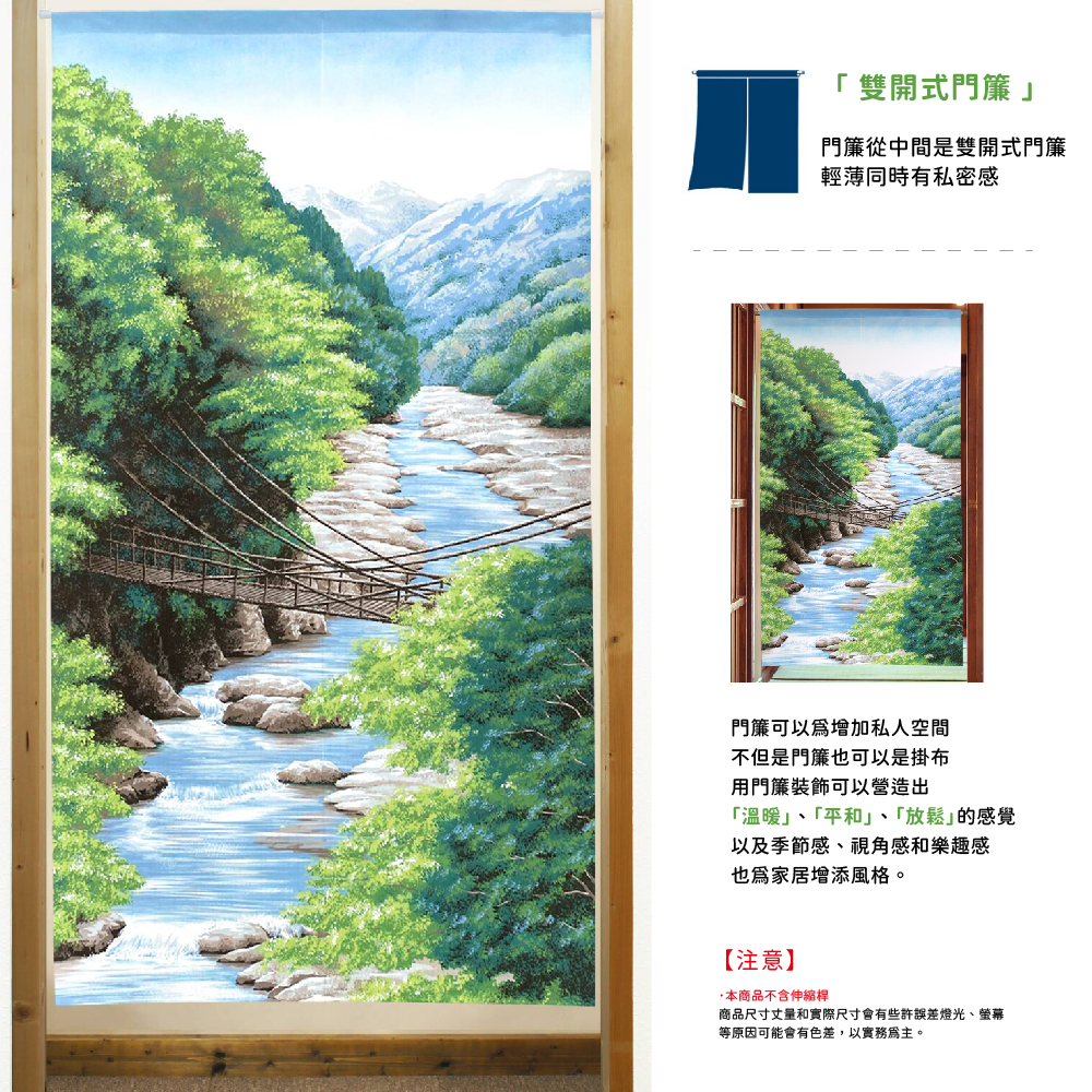日本製【コスモ】長門簾《蜿蜒溪谷》自然にあふれた風景や外国の街並み、世界遺産などを取り揃えた『風景のれん』シリーズ。自然豊かなデザインは癒しの空間に。海外の庭園や風景、世界遺産のデザインは旅行気分に。縦にストライプ状のレース編模様がある、編みレース生地を使用。レース生地の中でもしっかりとした生地ですので反対側がシルエット調に見えるくらいの透け感があります。『暖簾の使い方はいろいろ』アパートの玄関を開けた時に室内が見えないように。ドアが無い空間の間仕切りに。収納棚の目隠しに。壁に掛けてポスターやタペストリーのように。空/海/ボート/癒し/夏「風景門簾」系列,以豐富的自然景觀山水、異國都市風景、世界遺產等為主題充滿自然氣息的設計,營造出輕鬆的空間。海外花園、風景、世界遺產的設計,讓你有一種在旅行的感覺。採用針織蕾絲布料製成,帶有垂直條紋蕾絲編織圖案,它是蕾絲面料中比較堅固的面料,它是如此透明,以至於另一面看起來像剪影。【門簾可以用於多種方式】當前門打開時隱藏公寓的內部你就看不到裡面的狀況用於無門分隔空間用於隱藏儲物架將其像海報或掛毯一樣掛在牆上河流/山脈/森林/自然/治癒生產國: 日本材質/成分:100%聚酯纖維包裝:獨立袋包裝尺寸:約85 公分(寬)x 150 公分(長)國際條碼:4943741953906出貨:門簾*1件清洗方式:可水洗、不可漂白、不可烘乾顏色:如圖,網頁產品因拍攝與各顯示器顯色不同關係,與實品略有差異, 此商品圖為參考用之情境圖示,產品內容以規格敘述內容為準適用:臥室門、廚房門、浴室門、衣櫥、玄關入口...等【注意事項】伸縮桿需自備,商品內容為門簾本體並無附桿子