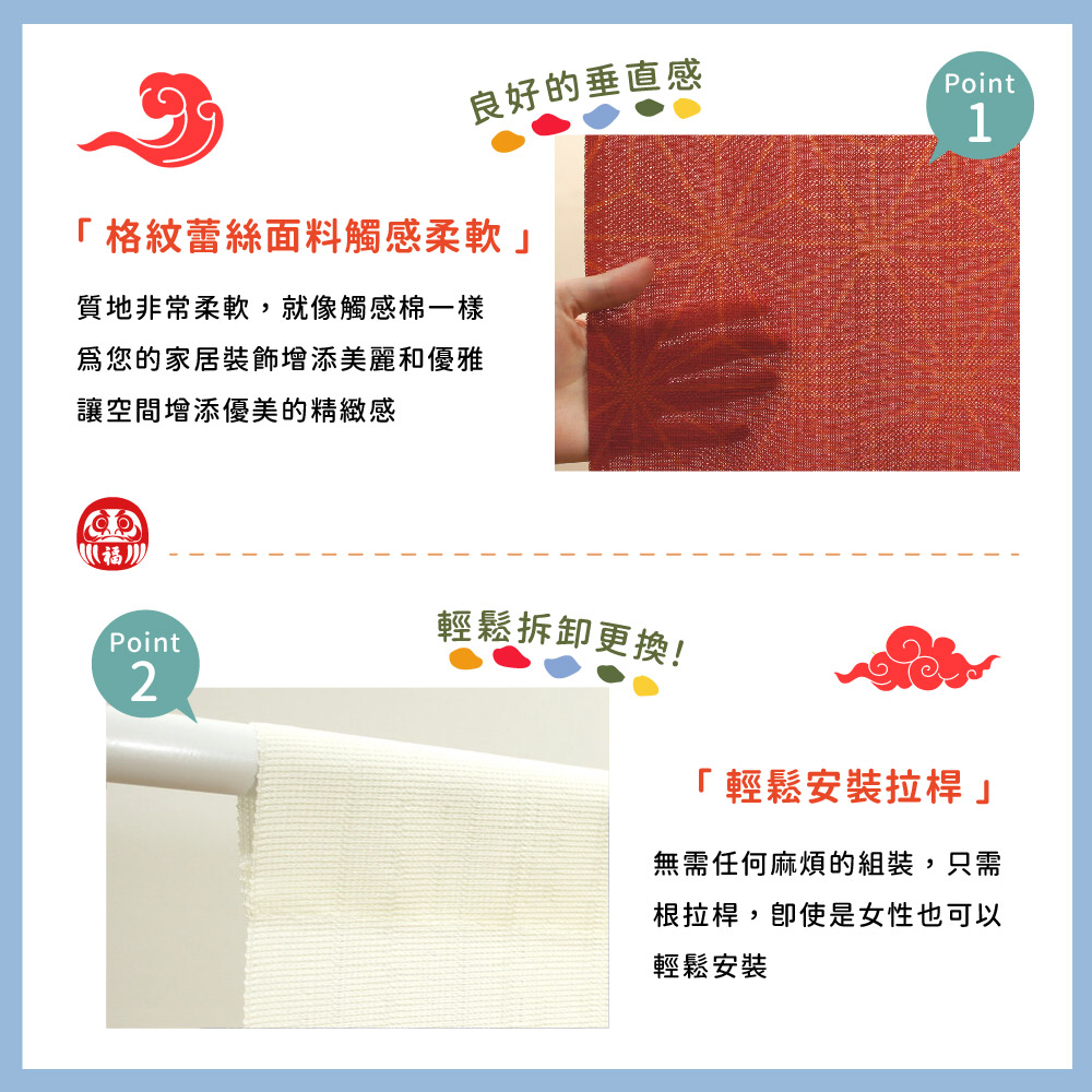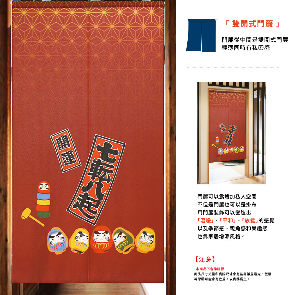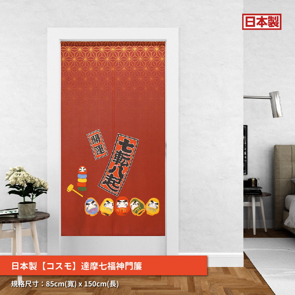 日本製【コスモ】長門簾《達摩七福神》幸運紅福の神として進行されている七福神や、「福来郎」「不苦労」などの語呂合わせから幸せを運ぶと言われているフクロウなど日本で古くから親しまれている縁起物をあしらったのれんシリーズです。場所を取らずに、縁起をかついだりお部屋の雰囲気を変えたりすることが出来ますので、インテリアに、お土産に、贈り物などにぜひご活用下さい。七福神被推崇為吉祥之神據說能帶來幸福。由於日文的貓頭鷹(フクロウ)可以稱作「不苦労」「福来郎」,對日本人來說,貓頭鷹從以前就是一種象徵幸運的動物。這是在日本長期流行的帶有幸運符的門簾系列。它們可以用來帶來好運或改變房間的氣氛而不佔用太多空間,它們可以作為室內裝飾、及送人紀念品、禮品等生產國: 日本材質/成分:100%聚酯纖維%包裝:獨立袋包裝顏色:紅色尺寸:約85 公分(寬)x 150 公分(長)國際條碼:4943741934387出貨:門簾*1件清洗方式:可水洗、不可漂白、不可烘乾顏色:如圖,網頁產品因拍攝與各顯示器顯色不同關係,與實品略有差異, 此商品圖為參考用之情境圖示,產品內容以規格敘述內容為準適用:臥室門、廚房門、浴室門、衣櫥、玄關入口...等【注意事項】伸縮桿需自備,商品內容為門簾本體並無附桿子
