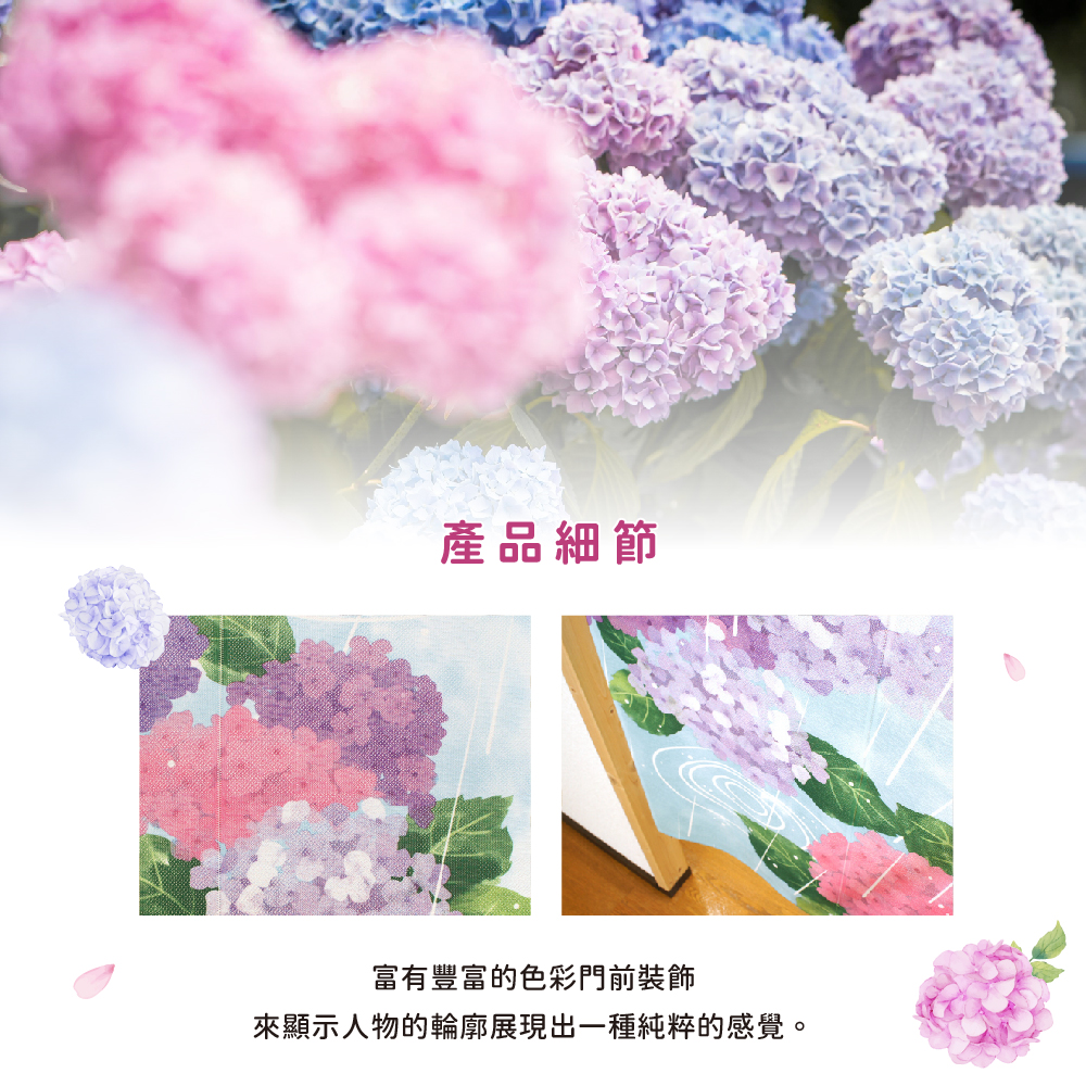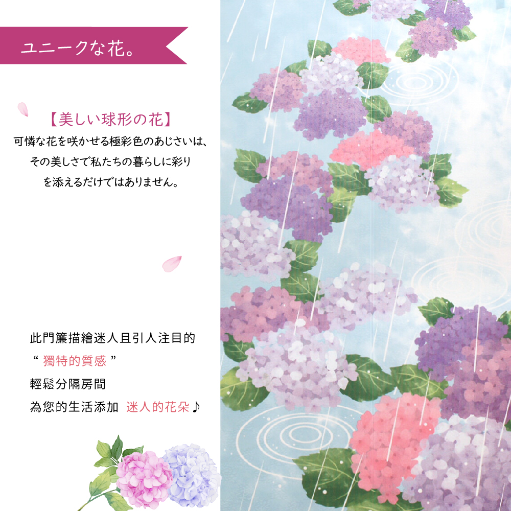 日本製【コスモ】長門簾《繡球花和雨》イラストレーター『山中奈緒子』による四季折々の草花。【夏】は色鮮やかな紫陽花(あじさい)と爽やかな雨模様が綺麗な色彩の商品です。插畫家山中直子的季節花卉和植物。【夏天】是個美麗的季節,以色彩鮮豔繡球花及清爽的雨絲為背景。 生產國:日本材質/成分:100%聚酯纖維包裝:獨立袋包裝尺寸:約85 公分(寬)x 150 公分(長)國際條碼:4943741902997出貨:門簾*1件清洗方式:可水洗、不可漂白、不可烘乾顏色:如圖,網頁產品因拍攝與各顯示器顯色不同關係,與實品略有差異, 此商品圖為參考用之情境圖示,產品內容以規格敘述內容為準適用:臥室門、廚房門、浴室門、衣櫥、玄關入口...等【注意事項】伸縮桿需自備,商品內容為門簾本體並無附桿子