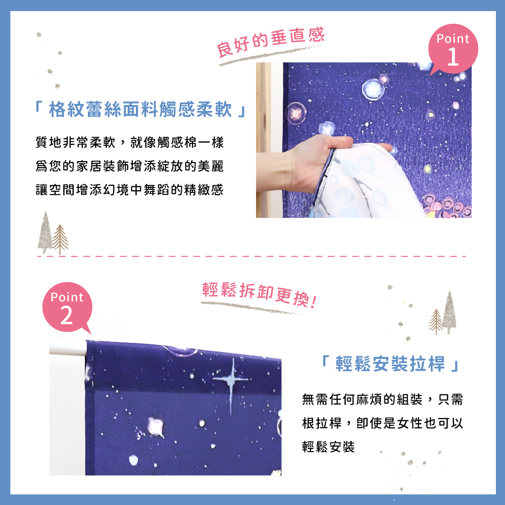 日本【コスモ】長門簾《夜空雪景》 「トロピカル生地使用」トロマットよりもやや薄手の生地で、軽くて白生地の光沢感がある平織の生地です。凸凹の少ないフラットな生地目でサラサラとした手触りが特徴です。周囲とスリット部分が丁寧に縫製された「本縫い仕立てのれん」です。ファンタジーな雪景色のデザインが癒しの空間を演出してくれます。シンプル/おしゃれ/スノー/夜空 【熱帶布料】這種布料比 Tromat 稍薄,重量輕,具有白色布料的光澤。它是一種平紋織物。其特徵是質地平坦,凹凸少,手感光滑。週邊和開縫部分經過精心縫製[Honsewn剪裁門簾]。奇幻的雪景設計營造出療癒的空間。簡約/時尚/雪景/夜空 生產國:中國進口國:日本材質/成分:100%聚酯纖維包裝:獨立袋包裝尺寸:約85 公分(寬)x 150 公分(長)國際條碼:4943741971245出貨:門簾*1件清洗方式:可水洗、不可漂白、不可烘乾顏色:如圖,網頁產品因拍攝與各顯示器顯色不同關係,與實品略有差異, 此商品圖為參考用之情境圖示,產品內容以規格敘述內容為準適用:臥室門、廚房門、浴室門、衣櫥、玄關入口...等 【注意事項】伸縮桿需自備,商品內容為門簾本體並無附桿子