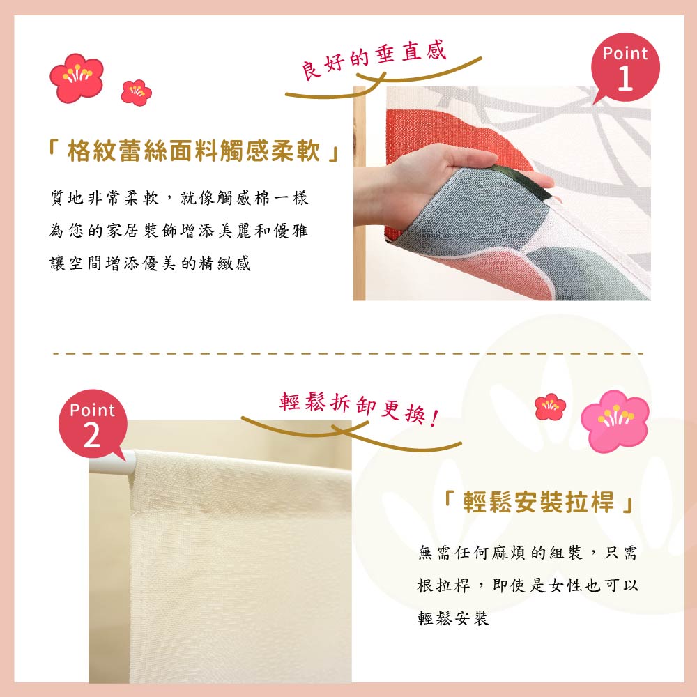 日本製【コスモ】門簾《山茶花》縁起物や季節の柄、美人画など様々な日本の文化を取り揃えました。お部屋やお店のインテリア、お土産物、贈り物などにぜひご活用くださいイラストレーター『山中奈緒子』による四季折々の草花。【冬】は綺麗な色彩の椿と、しんしんと降る雪の背景のデザインです。我們有各種各樣的日本文化物品,包括幸運符、季節圖案和美女肖像。請隨意將其用作房間或商店的室內裝飾、紀念品或禮物。插畫家山中直子 (Naoko Yamanaka) 繪製的四季花卉和植物。以色彩絢麗的山茶花和飄落的雪花為背景進行設計。請用於您的房間、商店、禮品生產國:日本材質/成分:100%聚酯纖維包裝:獨立袋包裝短門簾尺寸:約85 公分(寬)x 45 公分(長)J13-06-45W國際條碼:4943741276050出貨:門簾*1件清洗方式:可水洗、不可漂白、不可烘乾顏色:如圖,網頁產品因拍攝與各顯示器顯色不同關係,與實品略有差異,此商品圖為參考用之情境圖示,產品內容以規格敘述內容為準適用:臥室門、廚房門、浴室門、衣櫥、玄關入口...等【注意事項】伸縮桿需自備,商品內容為門簾本體並無附桿子