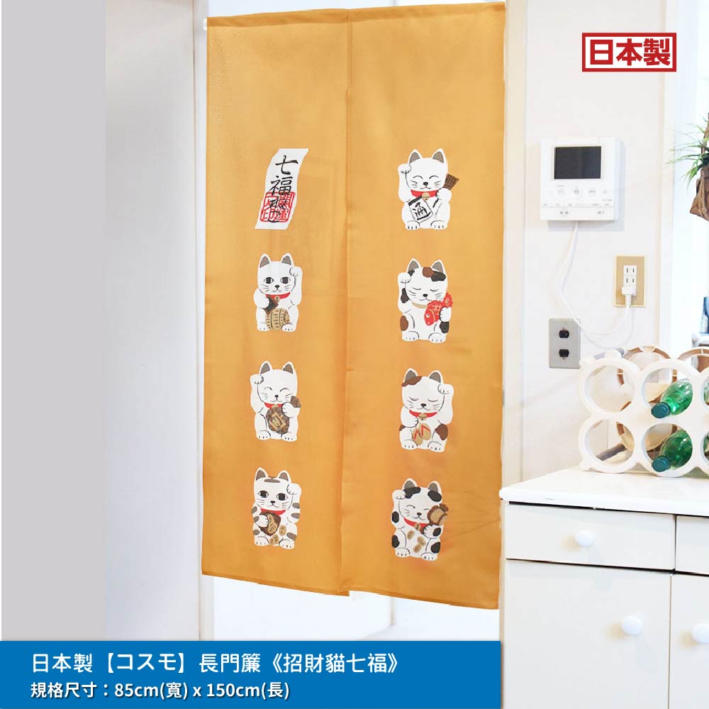日本製【コスモ】長門簾 《招財貓七福》幸運黃
