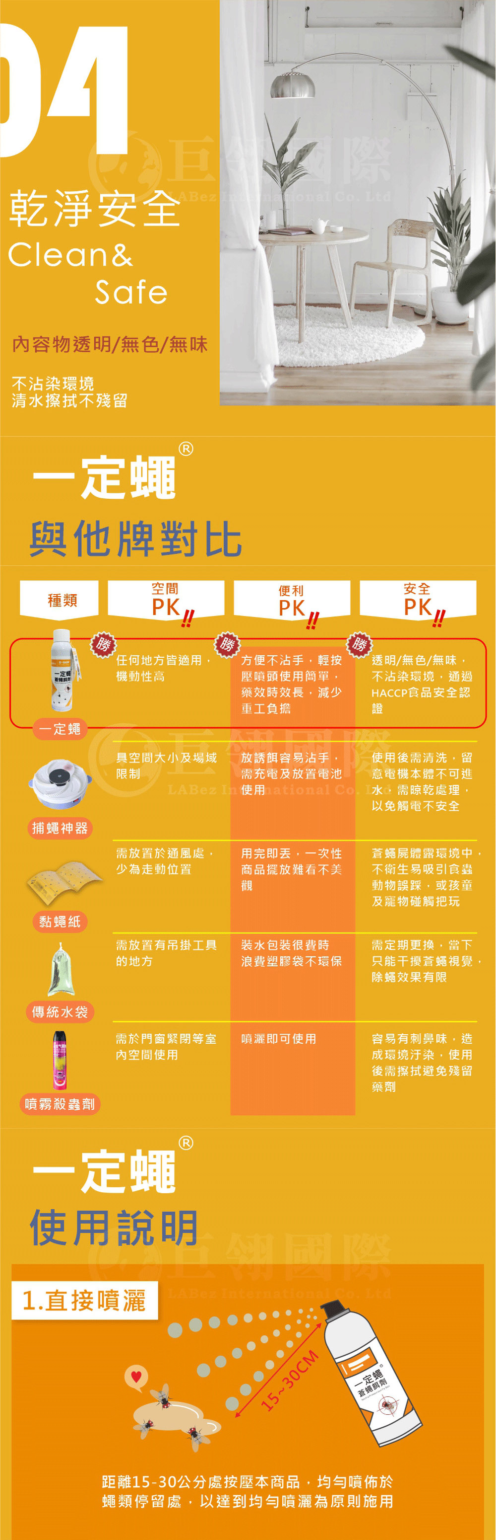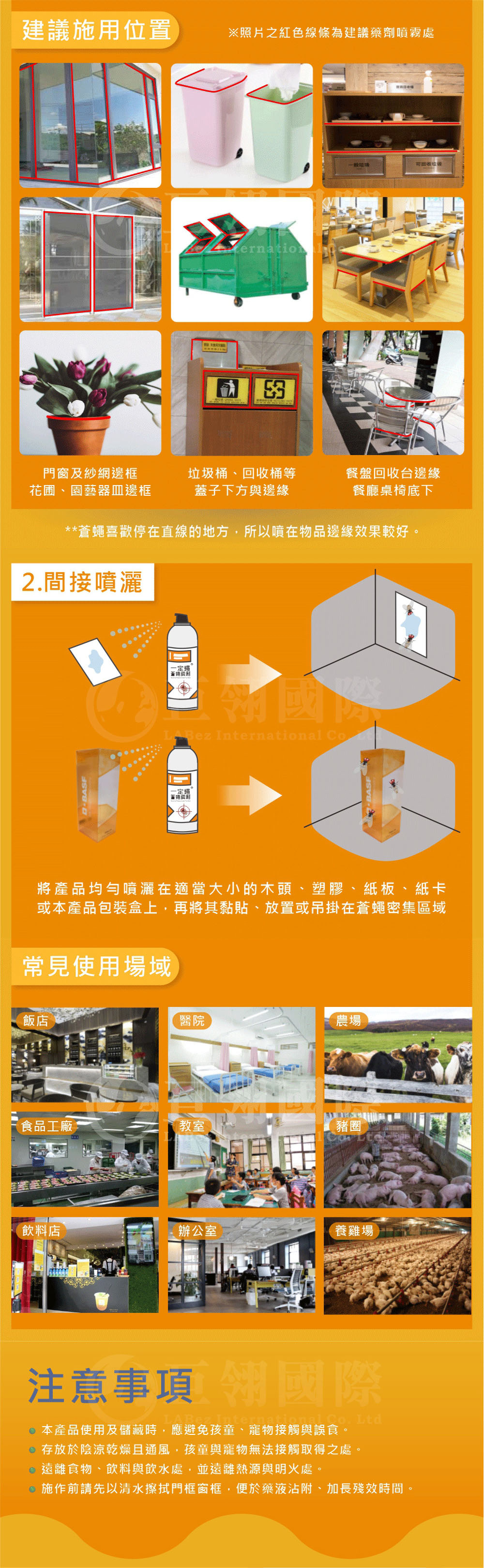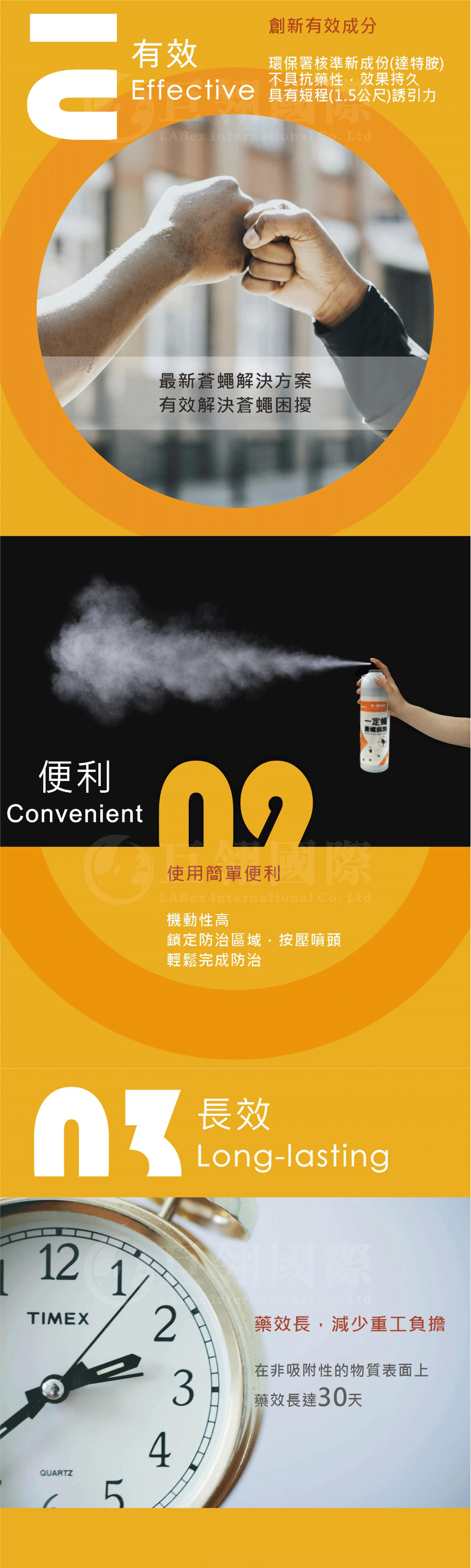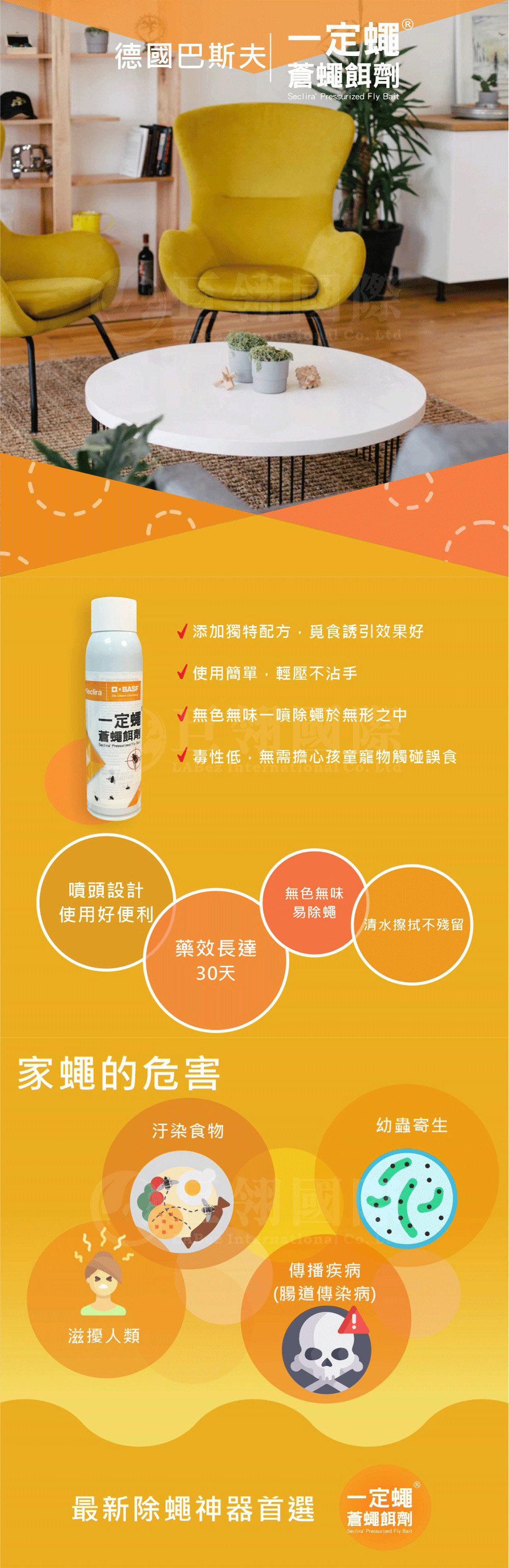 巴斯夫最新引進台灣的《一定蠅》蒼蠅餌劑產品,創新有效成分及獨特誘引配方,是一種有效又方便使用的餌劑類產品,利用蒼蠅舐吮習性將有效滅蠅成分吃進蒼蠅體內,達到滅殺居家蒼蠅。壓力罐噴式餌膠使用方便,無色無味乾淨安全,絕對是居家、餐飲業、連鎖超商、民宿、農場、食品工廠...等場所 最佳的蒼蠅防治武器。