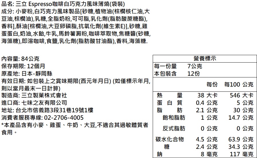 三立濃縮咖啡白巧克力風味薄燒(袋裝)