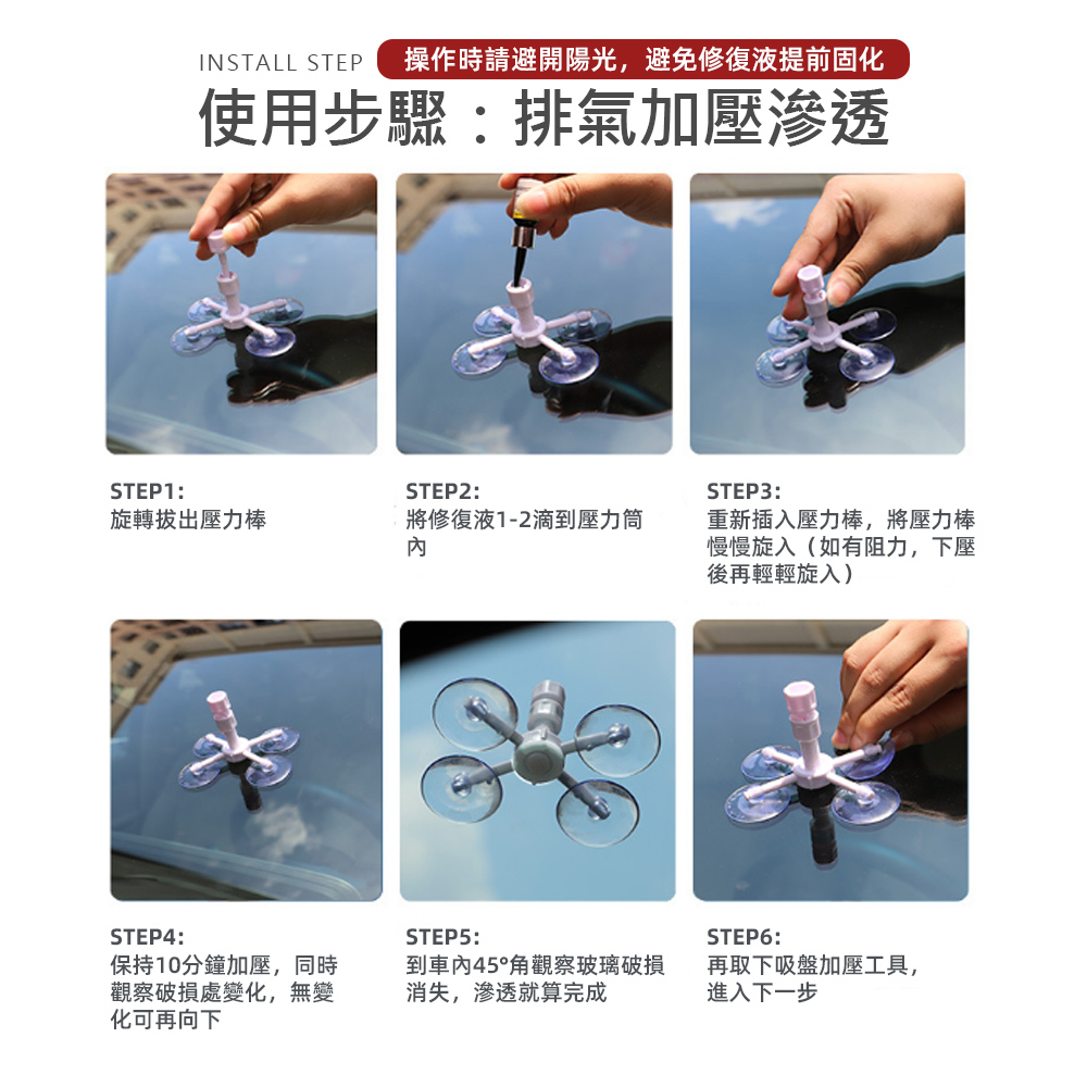 ⚠ 溫馨提醒:修補液需透過「紫外線」才能固化,請務必在天氣晴朗的陽光下操作,或使用紫外線燈輔助照射。若玻璃裂痕過長或已穿透內層,建議尋求專業更換服務。