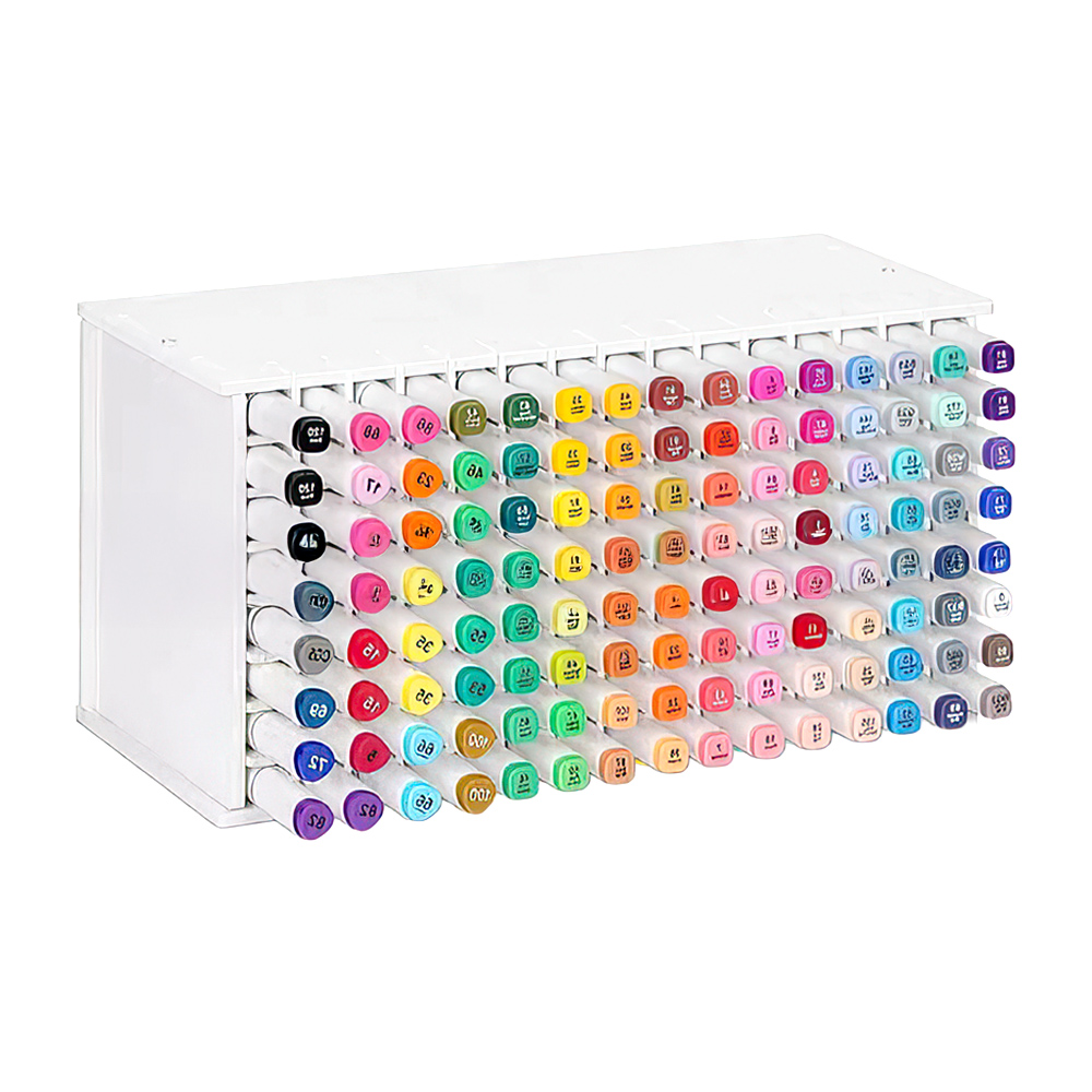 這款馬克筆筆架採用多孔分格設計,讓每一支筆都有固定位置,顏色可依深淺或色系排列,像調色盤一樣直覺好找。72孔與120孔兩種規格可選,輕巧穩固、不佔空間,讓創作環境更清爽。