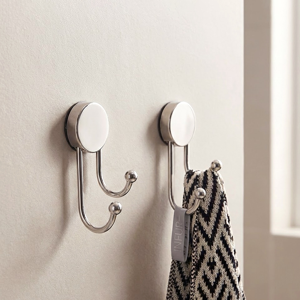這款吸盤掛鉤採用冰川銀不鏽鋼材質,質感低調耐看;吸盤按壓即可上牆,不需打孔不傷牆面。圓潤雙球掛勾設計,掛衣物、毛巾或包包不易勾傷,日常收納更安心。
