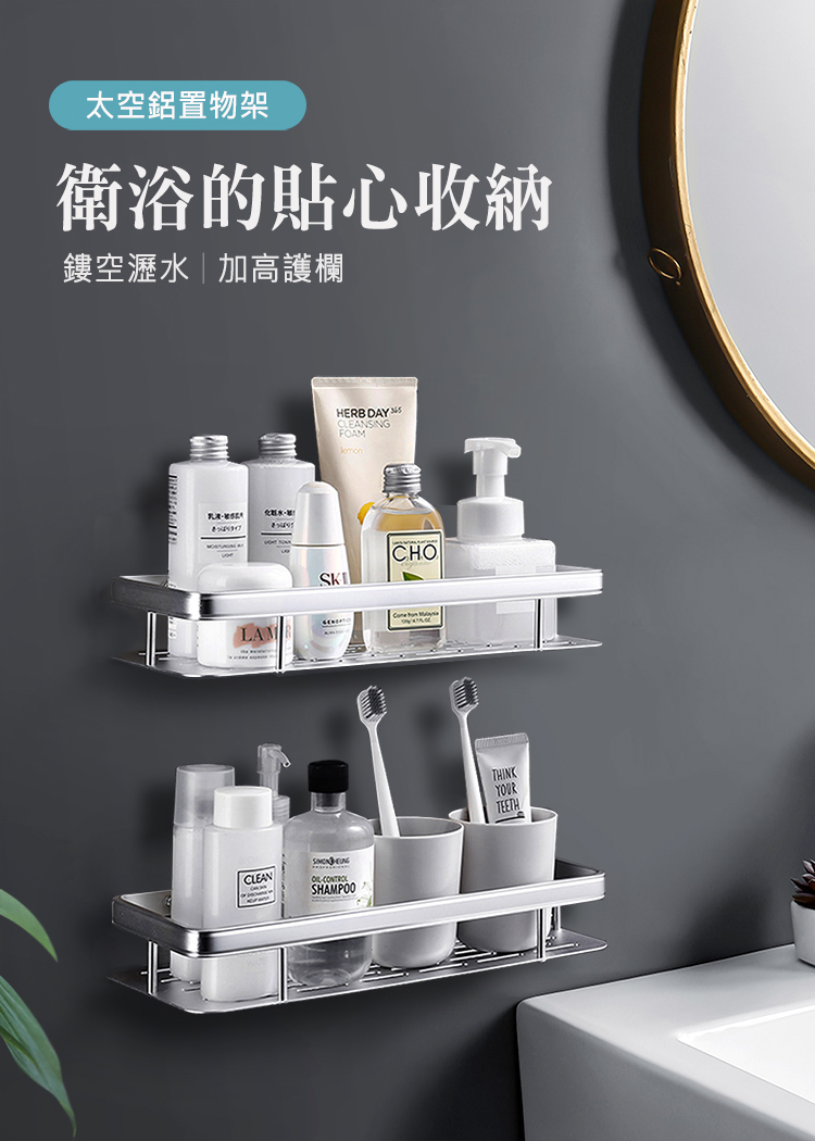 【上手家居】太空鋁無痕置物架-銀白色(浴室收納/廁所置物架/浴室收納架/無痕置物架/太空鋁沐浴露架)