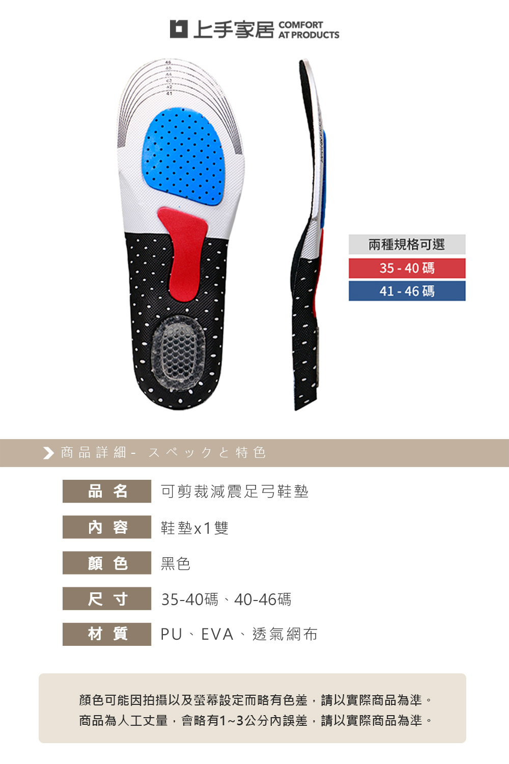 ⚠ 溫馨提醒:剪裁時建議先比對原有鞋墊大小,由大至小修剪,避免一次剪裁過多。