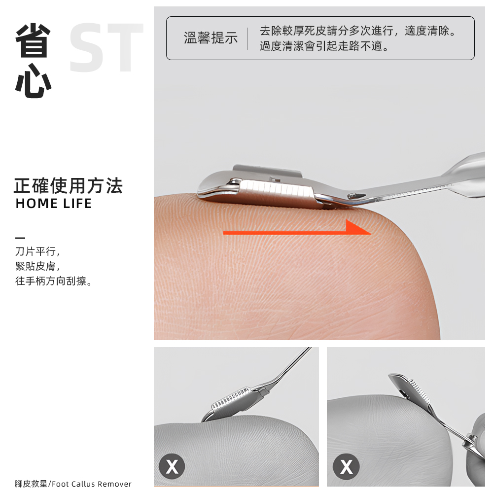 ⚠ 溫馨提醒:去除較厚死皮時請分多次進行,適度清除,過度清潔會引起走路不適。