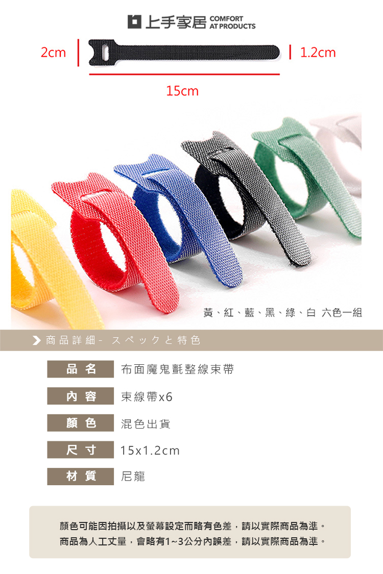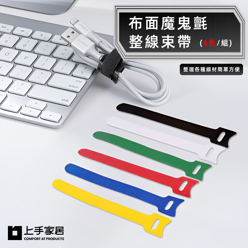 【上手家居】布面魔鬼氈束帶 6色組-混色(電線收納/束線帶/集線/繞線器/魔鬼沾/收線扣/紮線帶)
