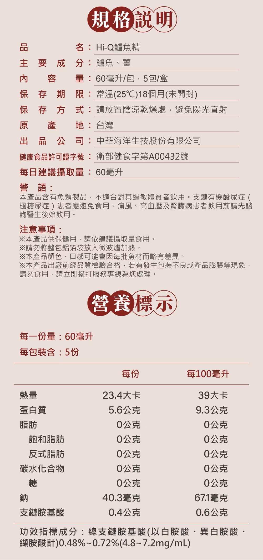 品名:Hi-Q鱸魚精健康食品認證經動物實驗結果,攝取本產品有助於延緩運動後疲勞發生。成分:鱸魚、薑每日建議攝取量:60 毫升內容量:60 毫升/包,5 包/盒保存方式:請放置陰涼乾燥處,避免陽光直射保存期限:常溫(25°C)18個月(未開封)原產地:台灣出品公司:中華海洋生技股份有限公司公司地址:臺北市松山區八德路4段123之1號諮詢電話:0800-043-388注意事項:● 本產品供保健用,請依建議攝取量食用。● 請勿將整包鋁箔袋放入微波爐加熱。● 本產品顏色、口感可能會因每批魚材而略有差異。● 本產品出廠前經品質檢驗合格,若有發生包裝不良或產品膨脹等現象,請勿食用,請立即撥打服務專線為您處理。警 語:● 本產品含有魚類製品,不適合對其過敏體質者飲用。● 支鏈有機酸尿症(楓糖尿症)患者應避免食用。● 痛風、高血壓及腎臟病患者飲用前請先諮詢醫生後始飲用。