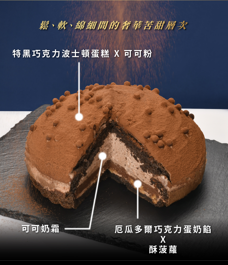 特黑巧克力波士頓蛋糕/可可奶霜/厄瓜多爾巧克力蛋奶餡/酥菠蘿/可可粉