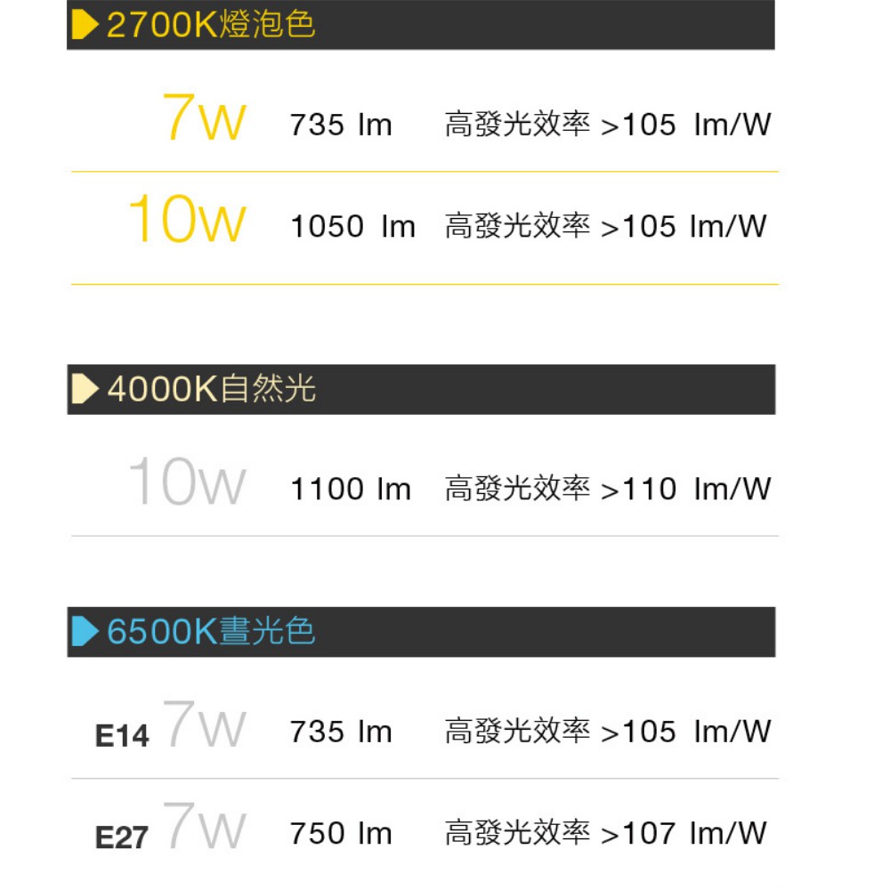 色溫 2700K黃光/4000K自然光/6500K白光