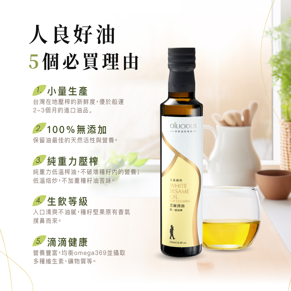 ‧專業輕焙製程,淺焙嚴選白芝麻,淡淡培火香氣保留白芝麻清爽原味‧透過純重力物理壓榨方式,萃取出黃金透亮富含芝麻香氣的芝麻清油‧含豐富維生素E、K、木酚素及鈣,有助骨骼、牙齒正常發育‧台灣在地生產,純物理重力壓榨,萃取第一道冷壓初榨油‧可生飲、煎炒烹飪、涼拌沙拉、低溫烘培、油封料理、調味沾醬、身體按摩‧不透光瓶身設計,隔絕光線不易氧化