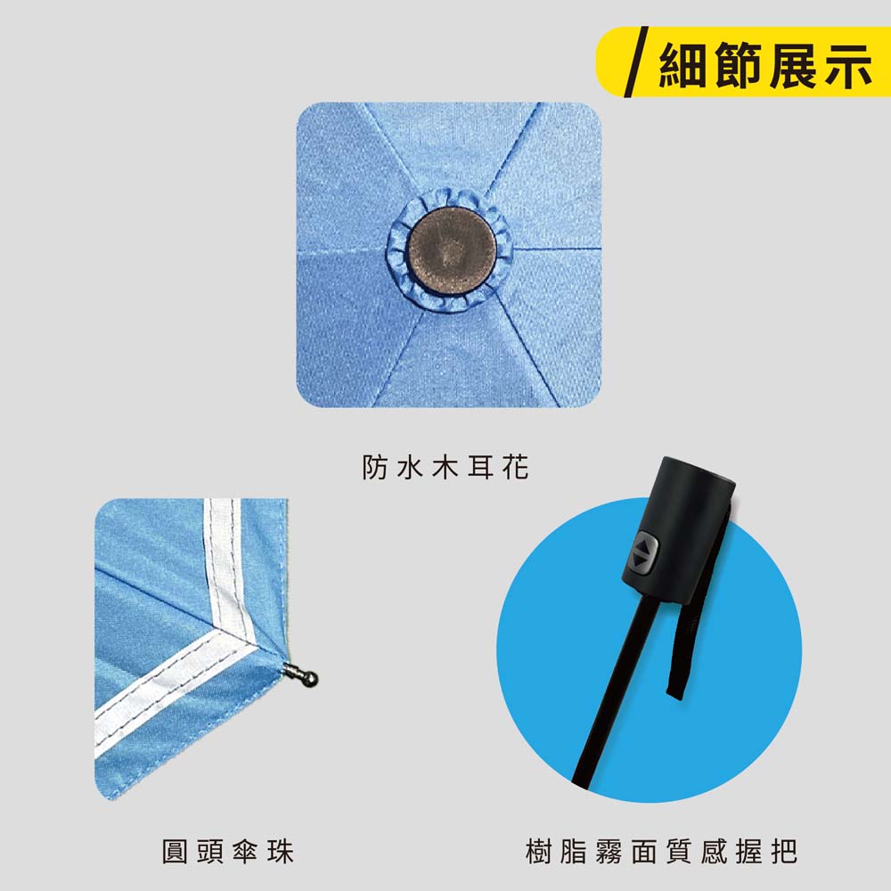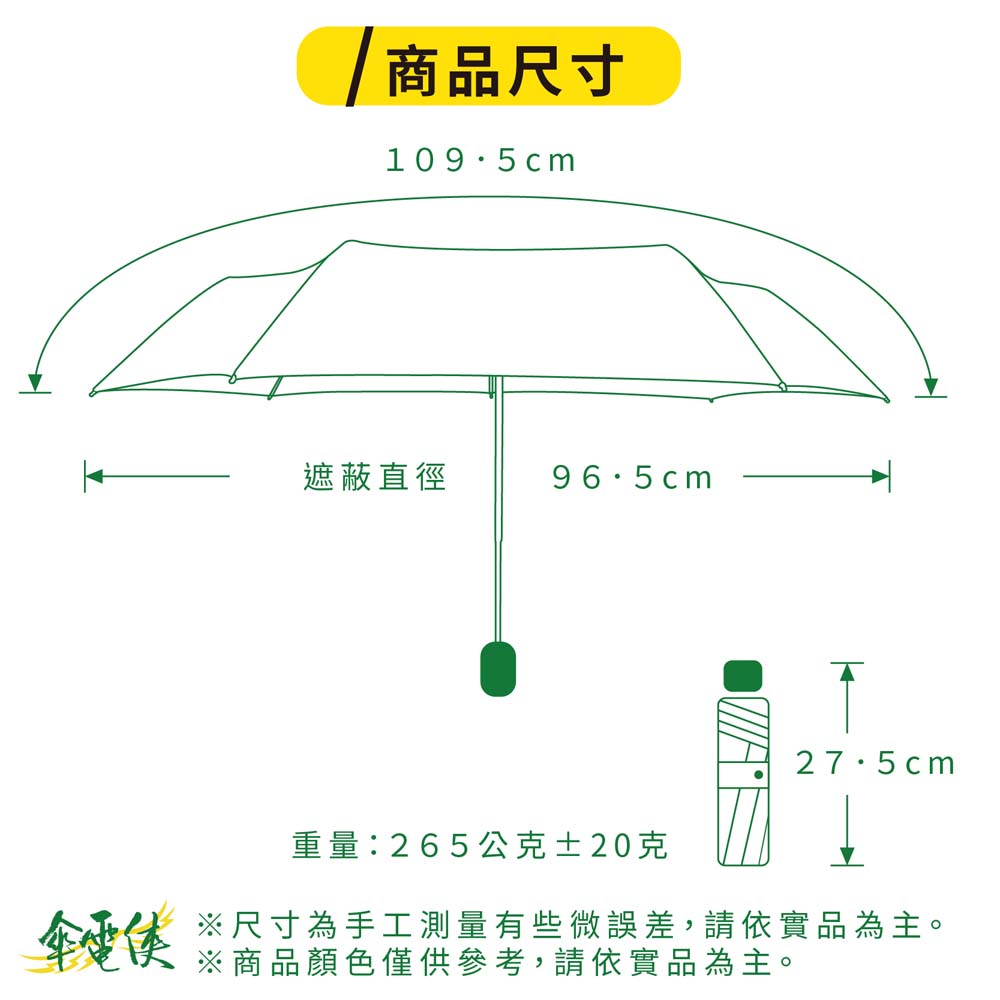 https://s-cf-tw.shopeesz.com/file/tw-11134208-7r98o-lksztqic73bp0a☂️【商品特色】⚡️本賣場皆為現貨,無需長期等待⚡超潑水PG傘布隔絕紫外線效果達95.5%傘下隔熱降溫達8°C傘布經過全國公證檢驗和紡織研究所品質有保證⚡️多樣素色傘面可選擇⚡️超省力中棒,1指輕鬆收合不費力⚡️霧面質感傘頭與握把, 質感再升級⚡8mm反光邊夜間使用更安全☂️【詳細規格】⚡傘骨:55X6K 鐵+FRP玻璃纖維⚡傘布:95.5%抗紫外線 PONGEE防潑水布⚡重量:265公克±20克⚡收合長度:27.5cm⚡展開直徑:96.5cm☂️【運送資訊】服務營業時間為週一至週五 9:00~12:00 13:00~17:00每週六及週日暫停出貨☂️【終身維修】傘電俠的商品均享有終身維修的服務,但因需更換的零件不同,我們會請專業維修人員一雨傘的實際狀況評估是否需要酌收更換零件的材料費用,我們會與您報價後,您再決定是否要維修。☂️【注意事項(退換貨/FAQ)】🔸傘電俠的商品都是原廠,提供優質雨具,有任何問題歡迎聊聊~🙋🏻♀️(收到商品後有疑問可以先聊聊,讓小編協助一起了解商品狀況,不要隨意退貨喲!><)<br />🔹下單後會盡量在3日內出貨,請大家也要記得取貨呦📦🔸收到商品有任何問題或需要維修服務可聯絡我們,若喜歡我們的商品,也歡迎留下您的好評👏🏻🔹六日與國定假日不營業,其餘上班時間會盡快處理訂單跟回覆訊息✉️🔸為保障彼此權益,拆封時請全程錄影,若商品有問題須於三日內提供全程錄影檔,逾期恕無法受理!🔹收到商品後所有任何瑕疵狀況,請於收到貨品後3日內提出(請保持商品在全新的狀態且包裝/吊牌完整,否則無法受理),如需退貨「請勿按完成訂單」,「按退貨選項即可完成退貨」🔸請正確使用雨傘以延長傘的使用壽命,淋雨後請務必撐開放置陰涼處陰乾。維修服務、正確使用/保養方式,請詳讀說明書。🔹尺寸皆為手工測量,會有些許差距。商品顏色會因每個螢幕顯示不同而有些許色差,若會介意下單前請三思。