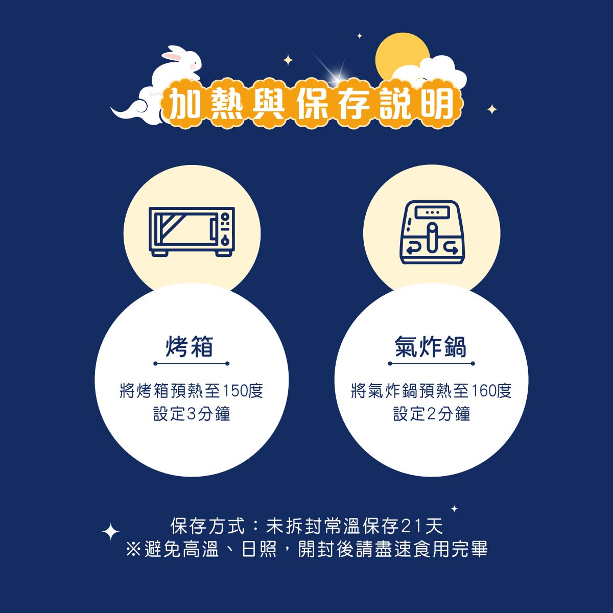 加熱方式:烤箱:將烤箱預熱至150度設定3分鐘氣炸鍋:將氣炸鍋預熱至160度設定2分鐘