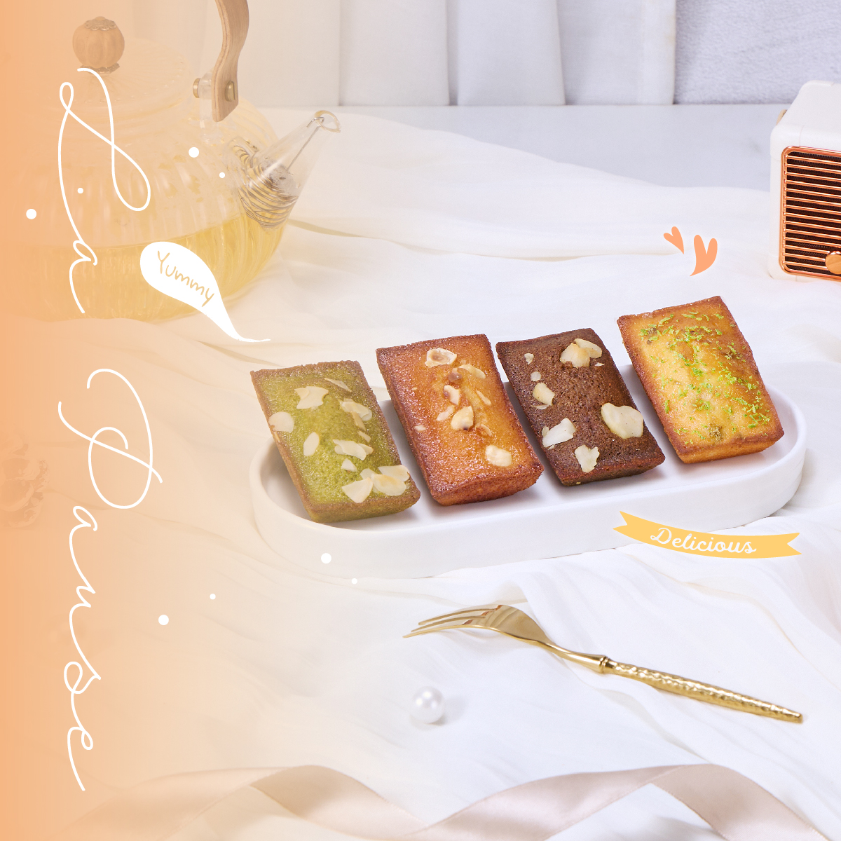 ➺ 伯爵火山豆費南雪|淡雅的伯爵茶香,微酥的火山豆,口感十足➺ 靜岡抹茶費南雪|微甜抹茶的茶香與輕焙杏仁片的木質香交織➺ 法式青檸費南雪|酸甜香氣,內藏比利時檸檬餡,果香濃郁➺ 蜜香榛果費南雪|金磚琥珀色,溫潤花蜜香氣與榛果的醇厚交疊