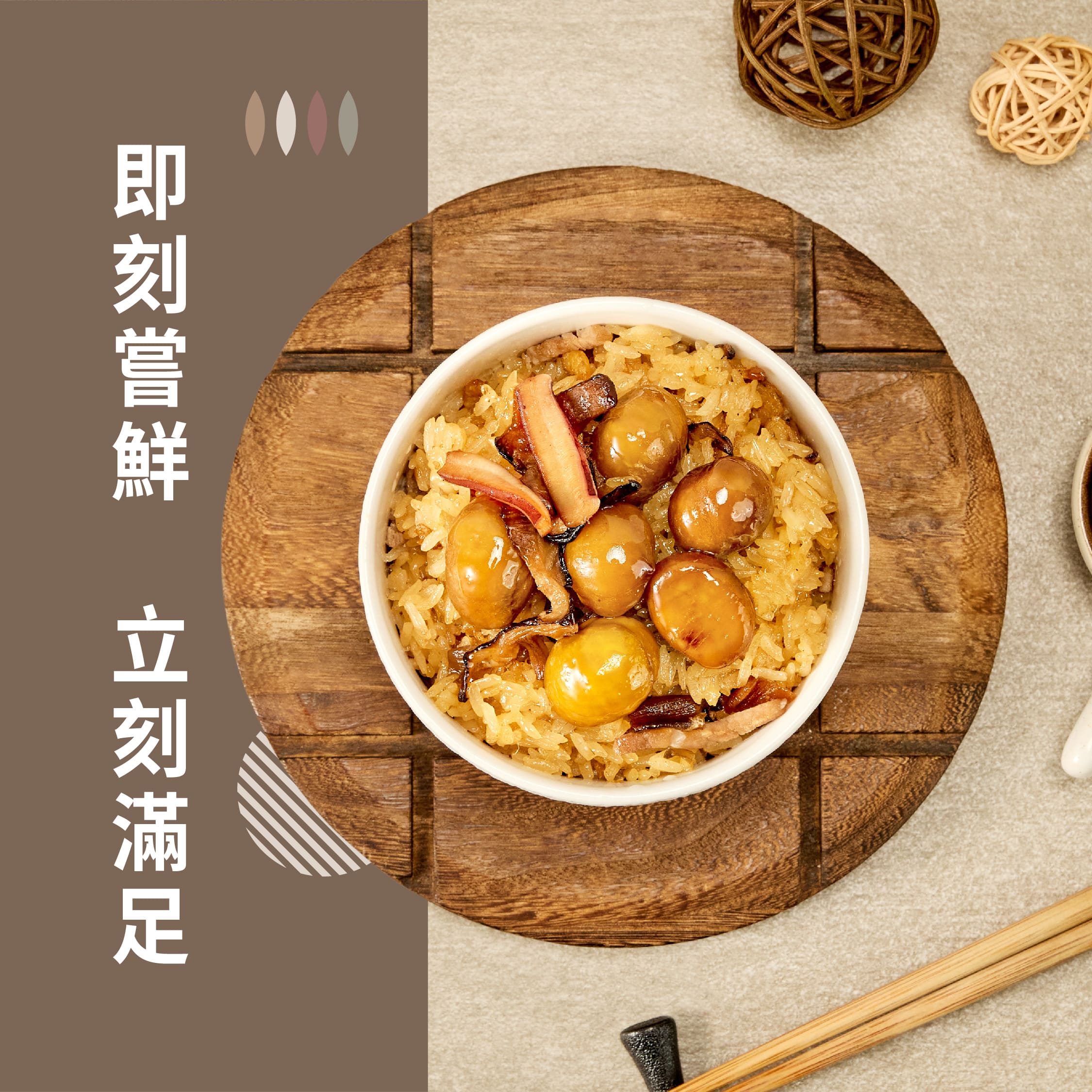 一口嚼進山珍海味,唇齒留香的經典美味精選臺灣在地長糯米混以麻油厚工蒸炊,粒粒香Q不黏牙、米香滿溢以臺灣本產香菇、肉絲、魷魚、金鉤蝦、蛋酥以及渾圓飽滿的栗子拌炒濃濃香味撲鼻而來,讓人一口接一口吃不停的經典美味