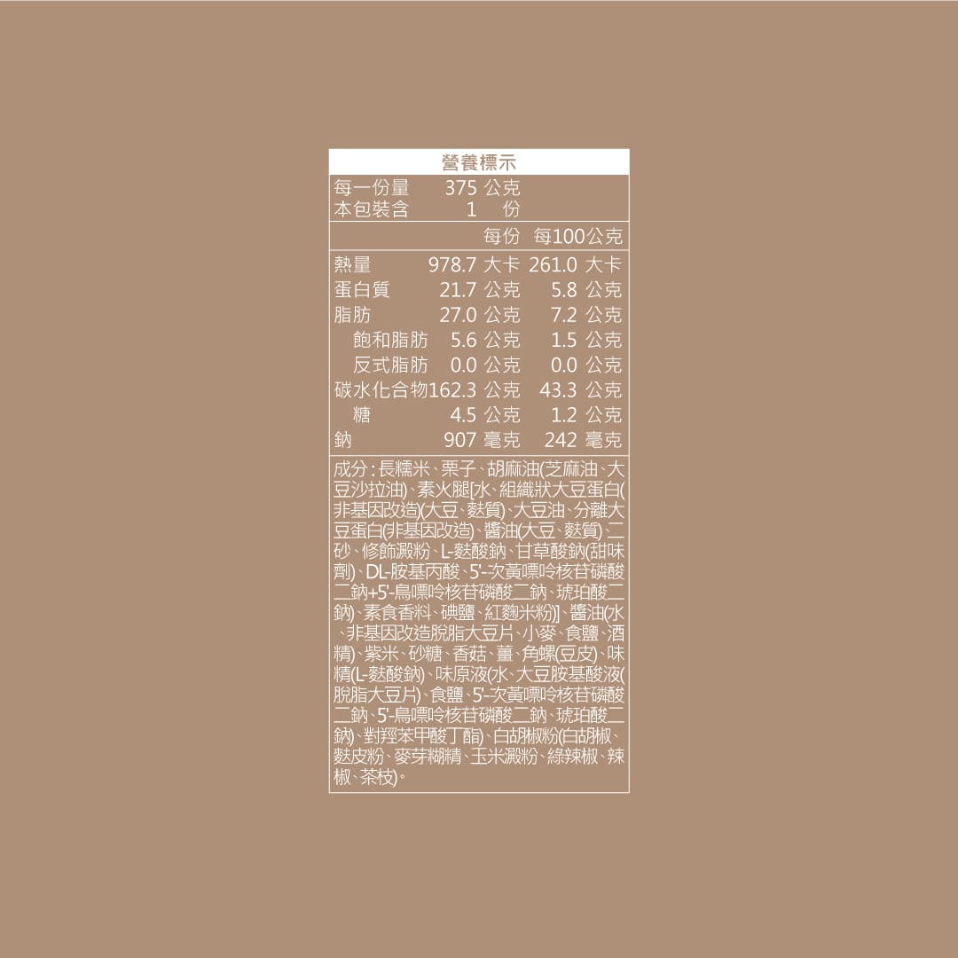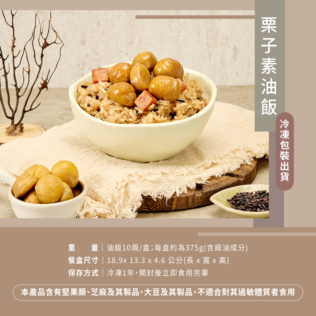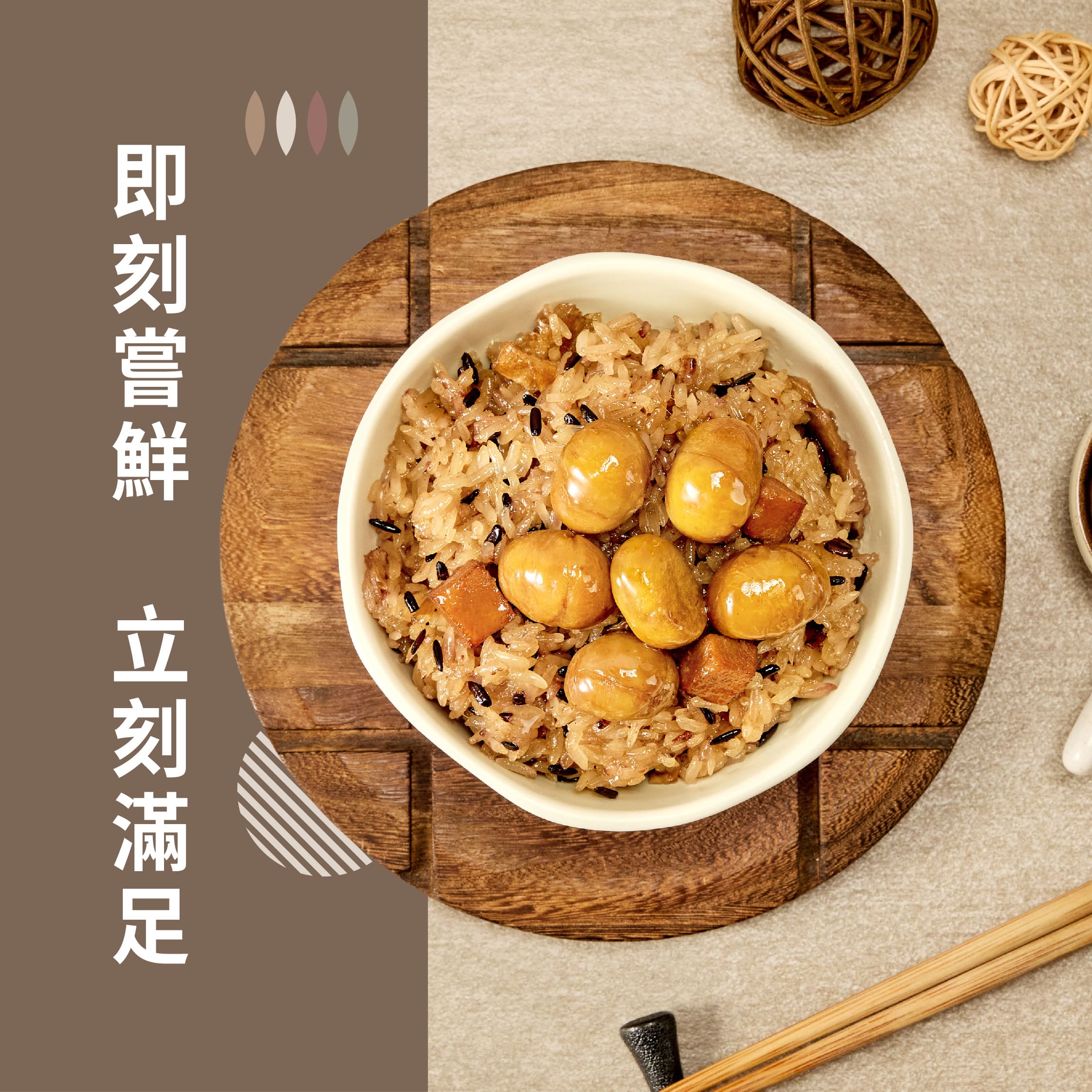 精心調配厚工蒸炊,口味清香甘甜美味精選臺灣在地長糯米,混以紫米、麻油厚工蒸炊粒粒香Q不黏牙、米香滿溢以臺灣本產香菇、素火腿、薑末以及渾圓飽滿的栗子拌炒香味隨之撲鼻而來不吃素的朋友都忍不住讚好的美味