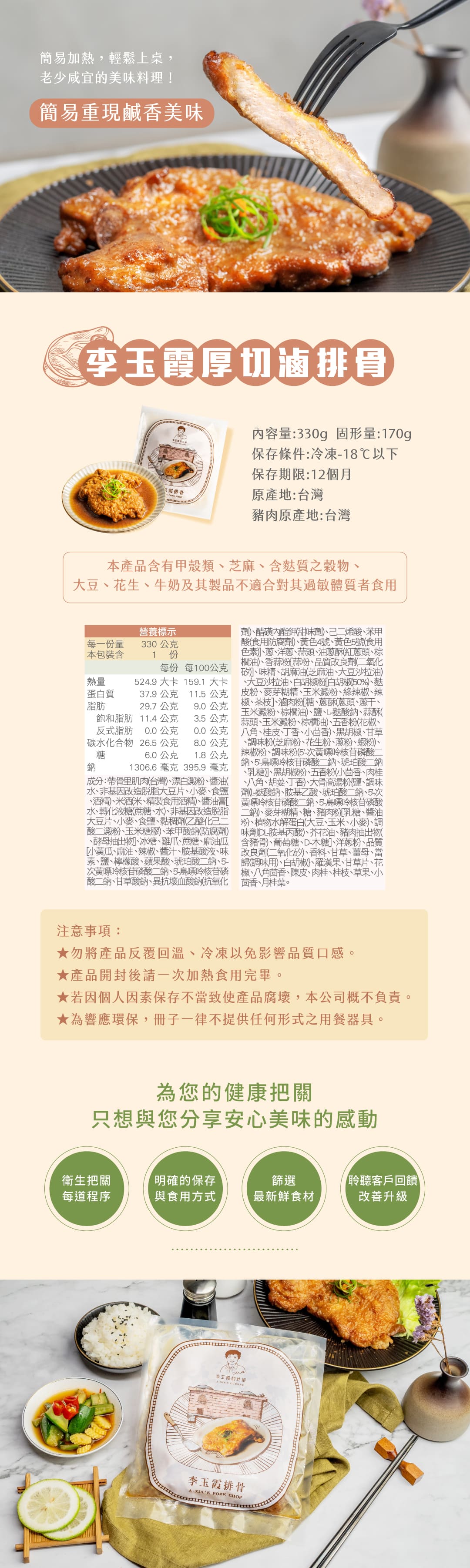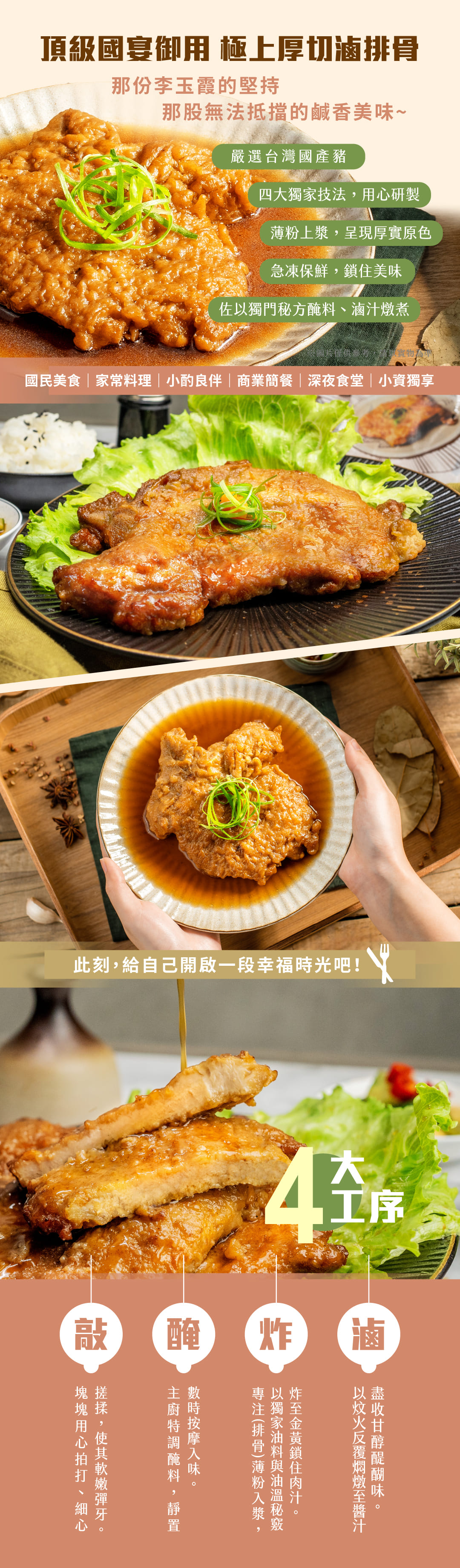 李玉霞是成功扭轉台鐵餐廳虧損的功臣,靠著排骨打響台鐵便當名號頂級國宴御用,極上厚切排骨,在家也吃的到嚴選台灣國產豬,四大獨家技法用心研製薄粉上漿呈現厚實原色佐以獨門秘方醃料、滷汁燉煮而成
