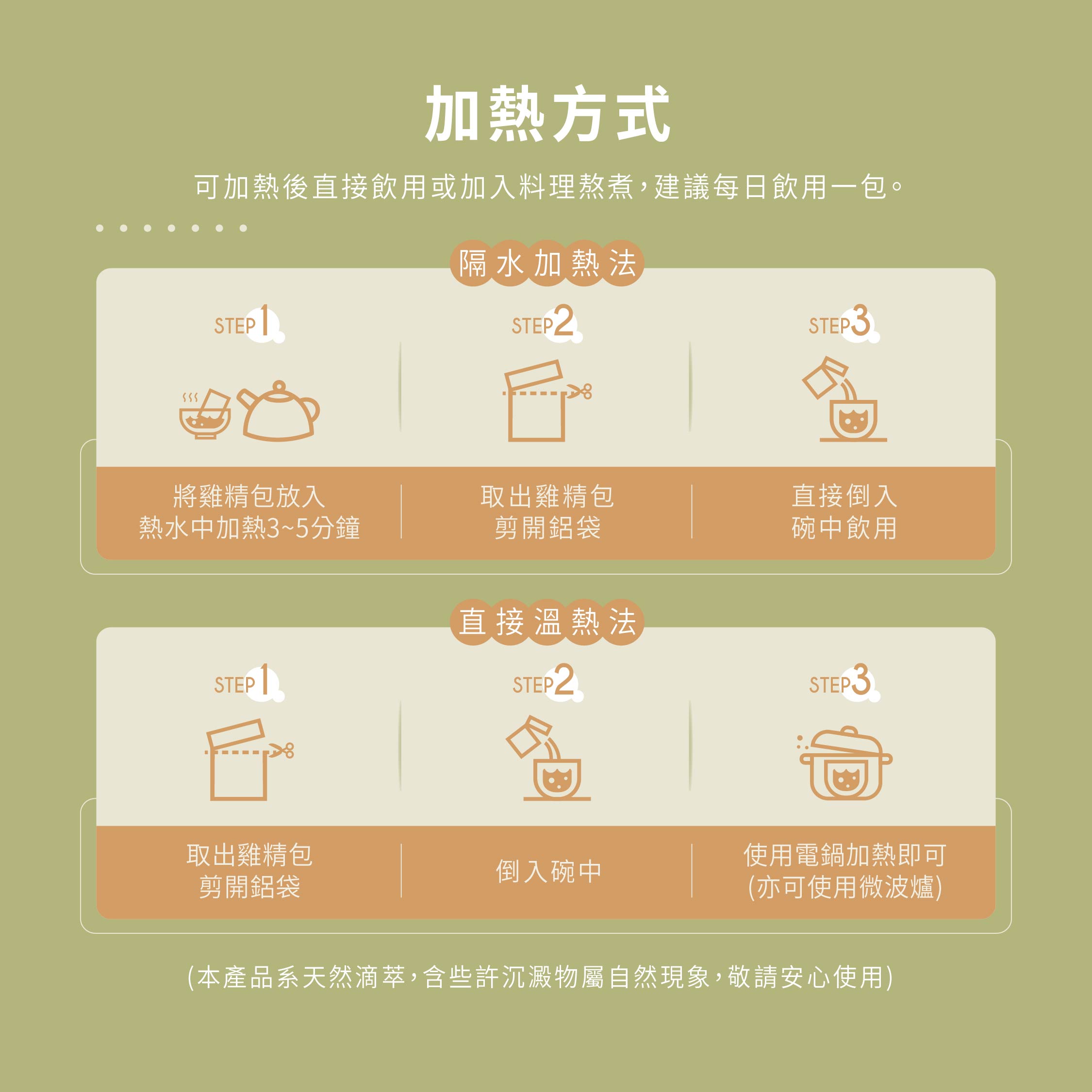 只需簡單隔水加熱,即可享受養身健體的冊子滴雞精採用台灣土雞純粹滴製,無腥味、無油脂讓您養身無負擔打造健康飲食生活的必備良品再忙,也要來一碗滴雞精養好身體