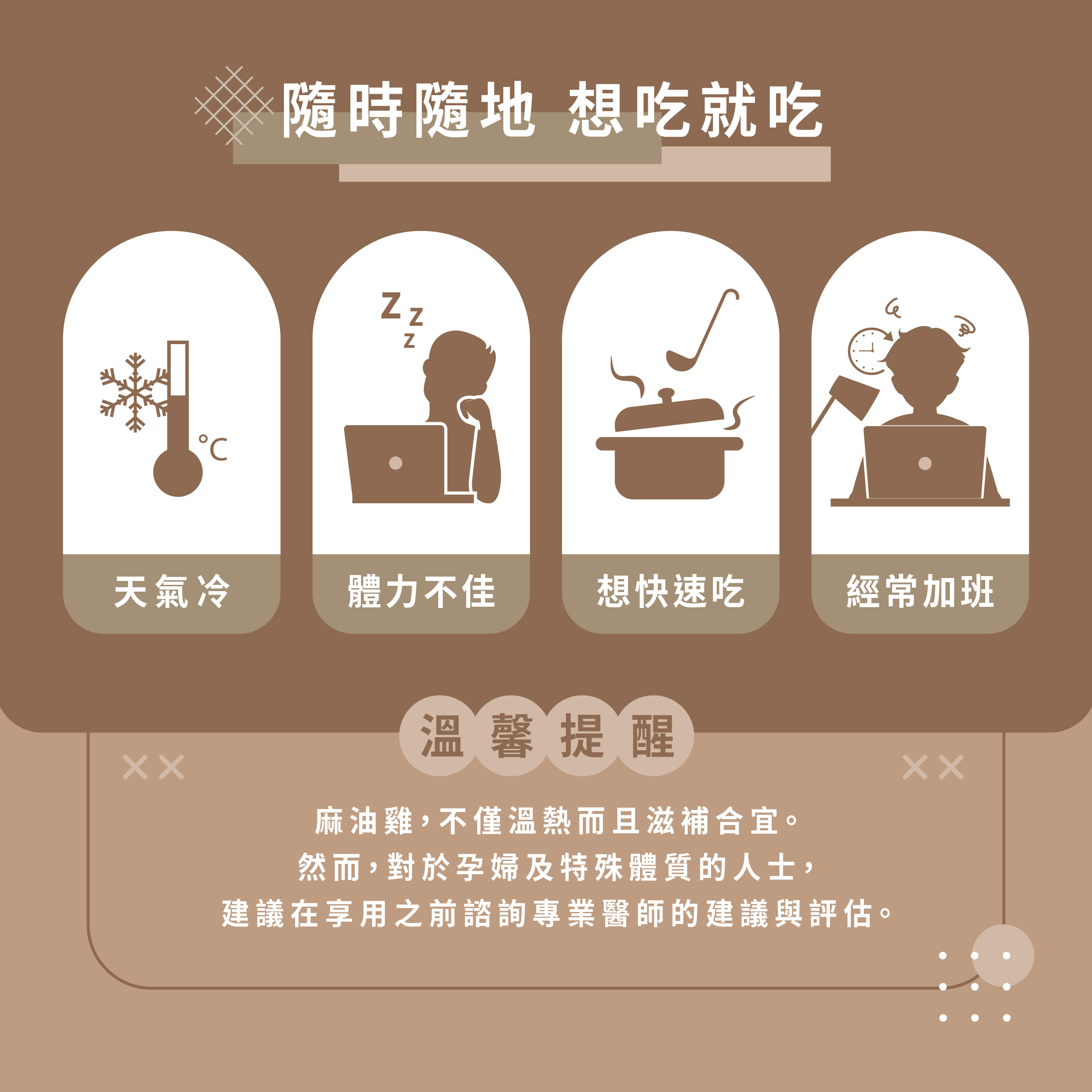 嚴選雞肉老薑中藥材,獨家口味順口不油膩嚴選臺灣雞肉與老薑拌炒,添加枸杞紅棗當歸等中藥材倒入米酒、麻油增添醇厚香氣,獨家口味獨立分裝只需簡單加熱,在家也能隨時品嚐的溫暖小確幸