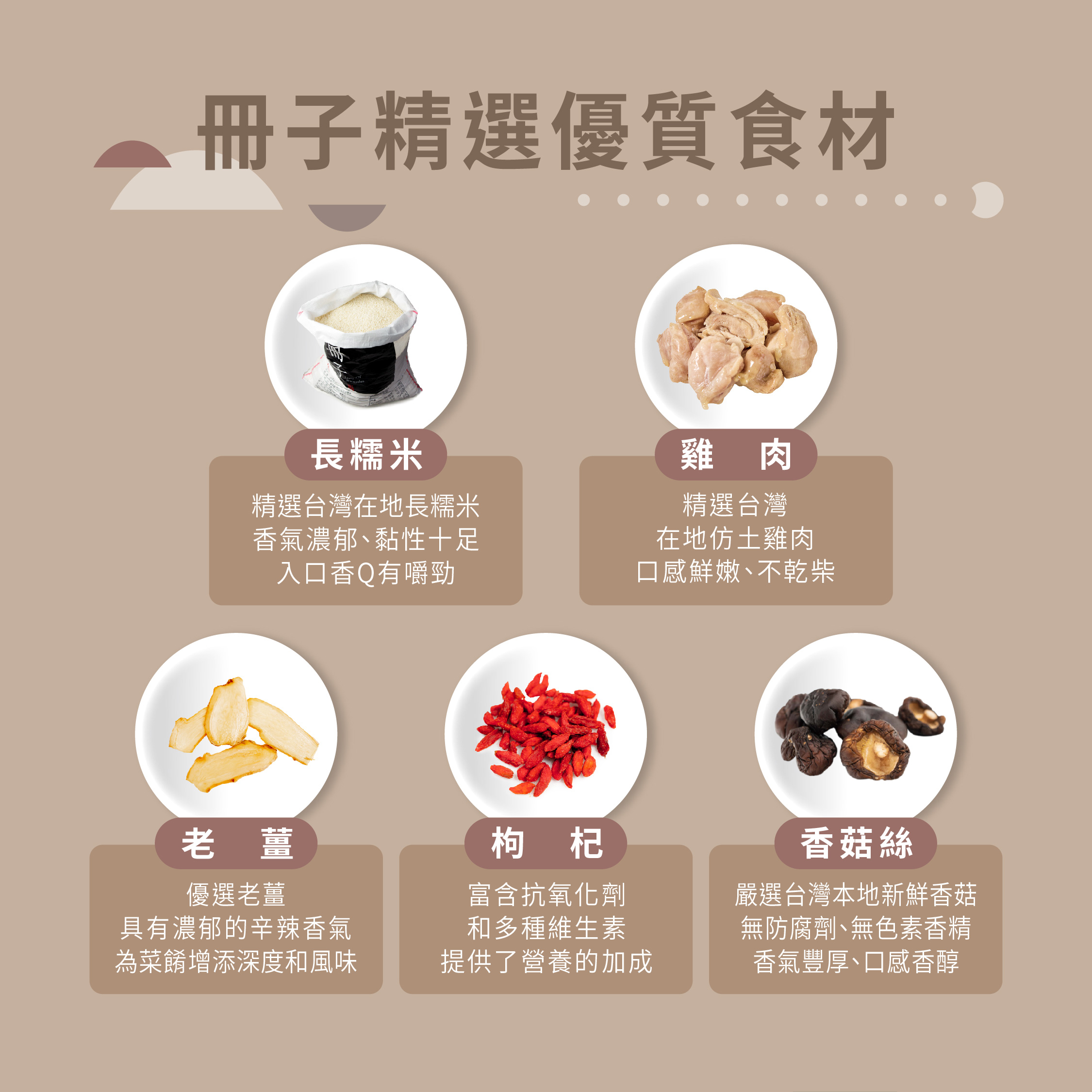 使用臺灣在地長糯米,粒粒香Q有嚼勁加入嚴選臺灣在地仿土雞與老薑拌炒香氣四溢,肉質暖嫩不乾柴,每一口都是滿滿麻油香