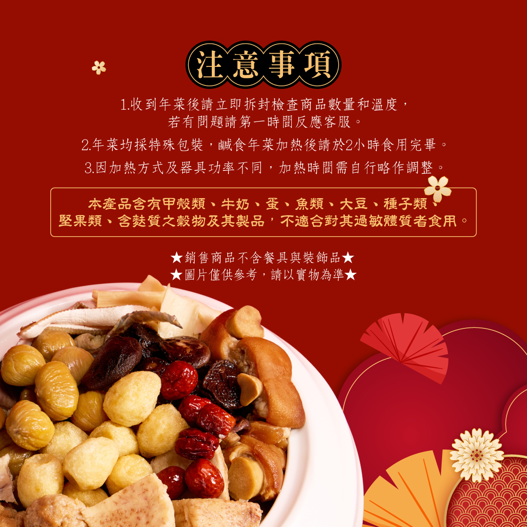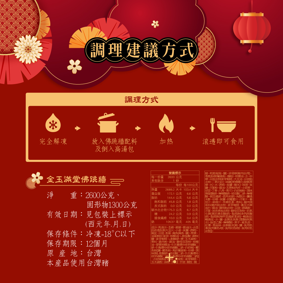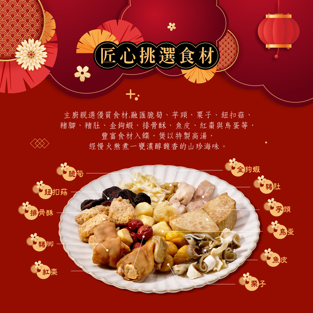 金玉滿堂佛跳牆 — 寓意新年財富滿滿、吉祥如意,為您和家人帶來最圓滿的幸福滋味🧧精選數十種的頂級食材,依食材特性以氽、蒸、炒、滷、炸、煨等工序細心處理,再煲以特製高湯,經長時間慢火熬製出甘醇濃郁、有層次的湯頭,主廚以精湛的料理工序,讓每樣食材保留獨有口感,同時也完美鎖住了高湯精華,輕咬一口,鮮香在口中散開更是迷人。➺ 真材實料|脆筍、芋頭、栗子、鈕扣菇、豬腳、豬肚、金鈎蝦、排骨酥、魚皮、紅棗與鳥蛋等➺ 特製湯底|繁雜工序與長時間地熬煮,品嘗出多層次的美味➺ 精心講究|以湯料分離的獨立包裝,鎖住最佳口感、完美風味